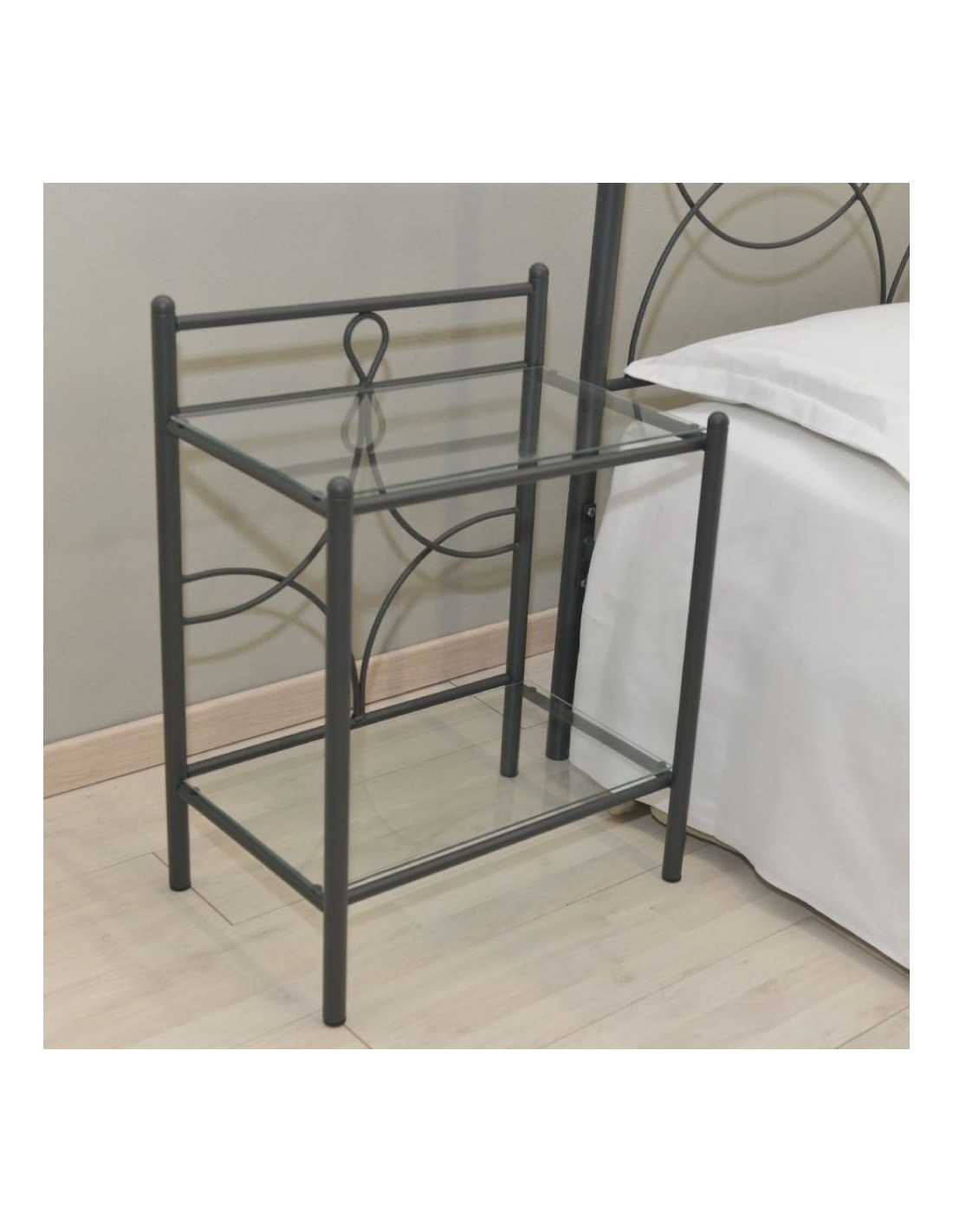 Elegante comodino in ferro battuto con due ripiani in cristallo.