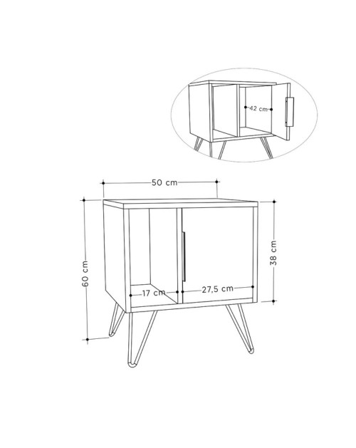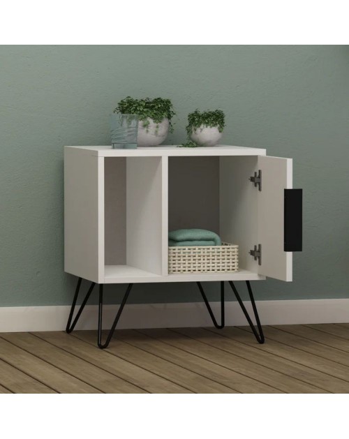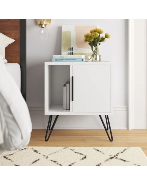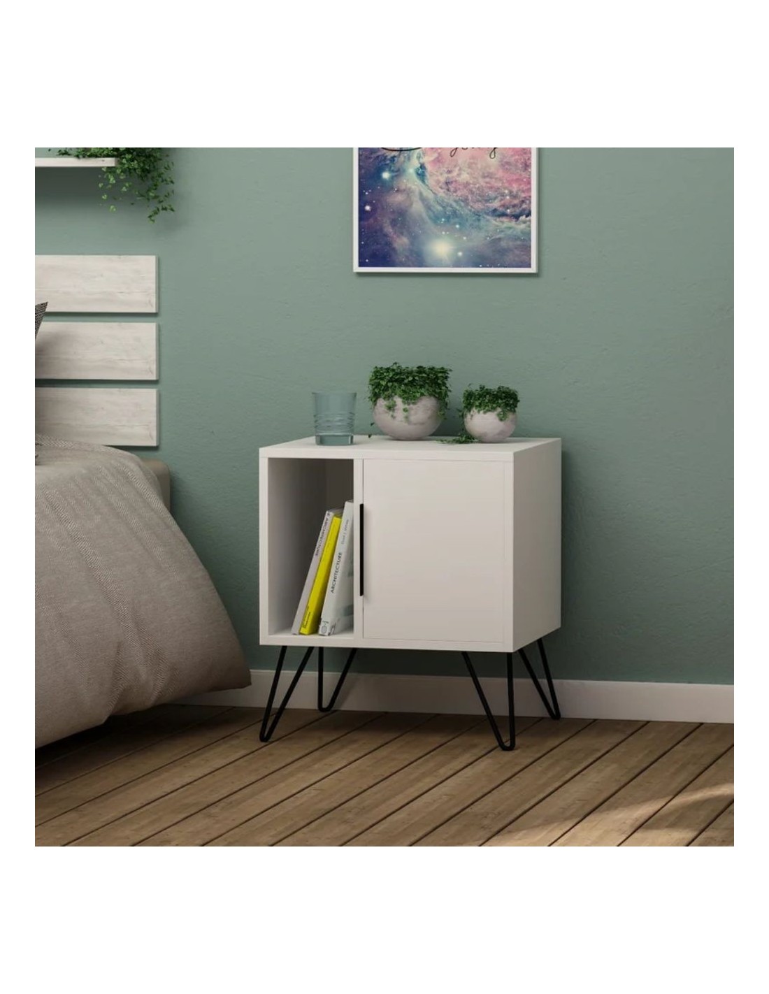 Comodino moderno dotato di anta battente e vano a giorno. Ideale per arredare con gusto la tua zona notte. Puoi abbinarlo sia ad ambienti moderni che classici. Particolari le gambe in metallo nero.