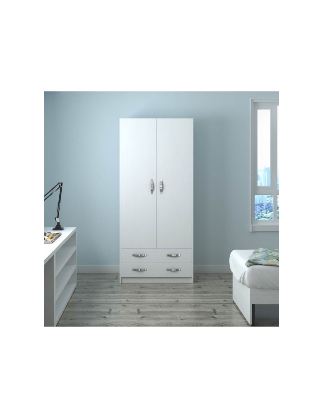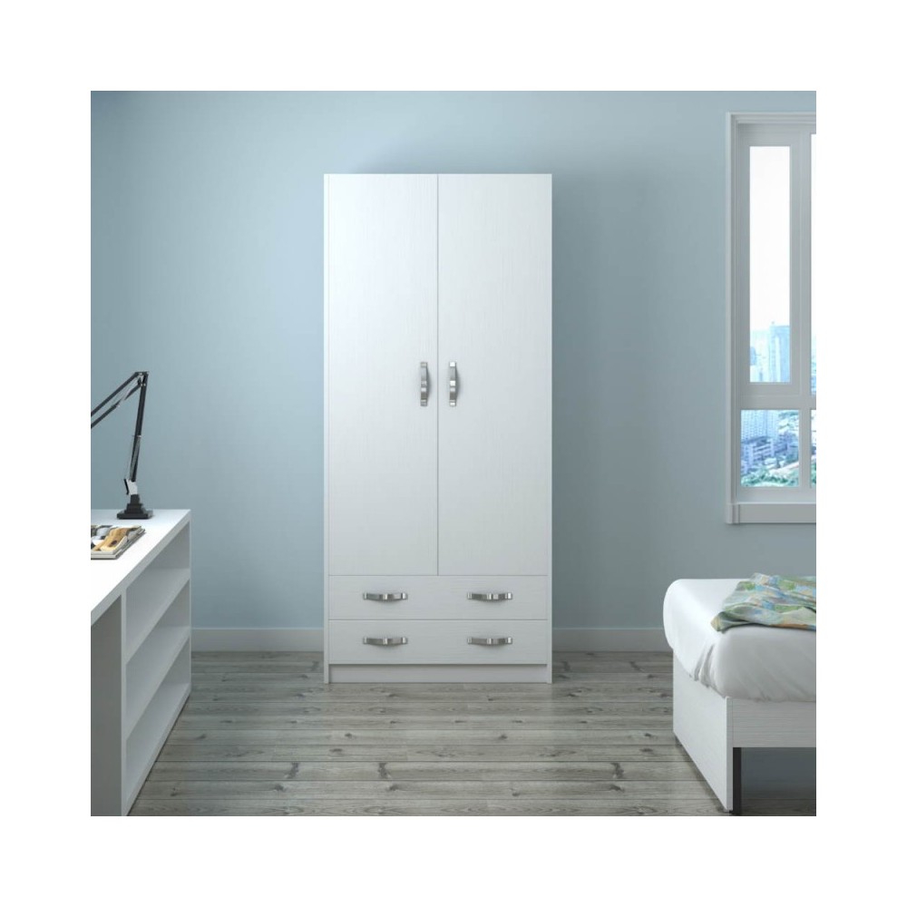 Semplice e utile armadio dotato di due ante e due cassetti. Ideale per stivare vestiti e maglie. I cassetti sono dotati di guide metalliche e rinforzo centrale. L'interno presenta una barra porta abiti, un ripiano e una base.