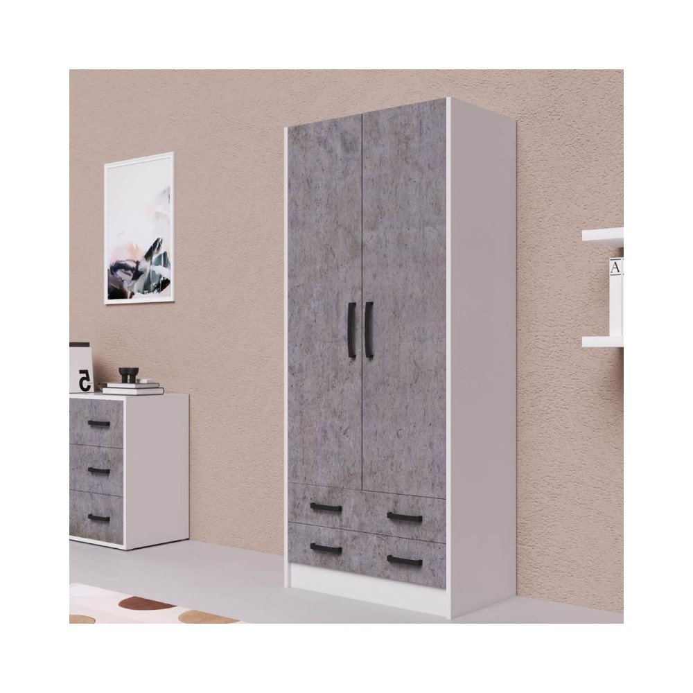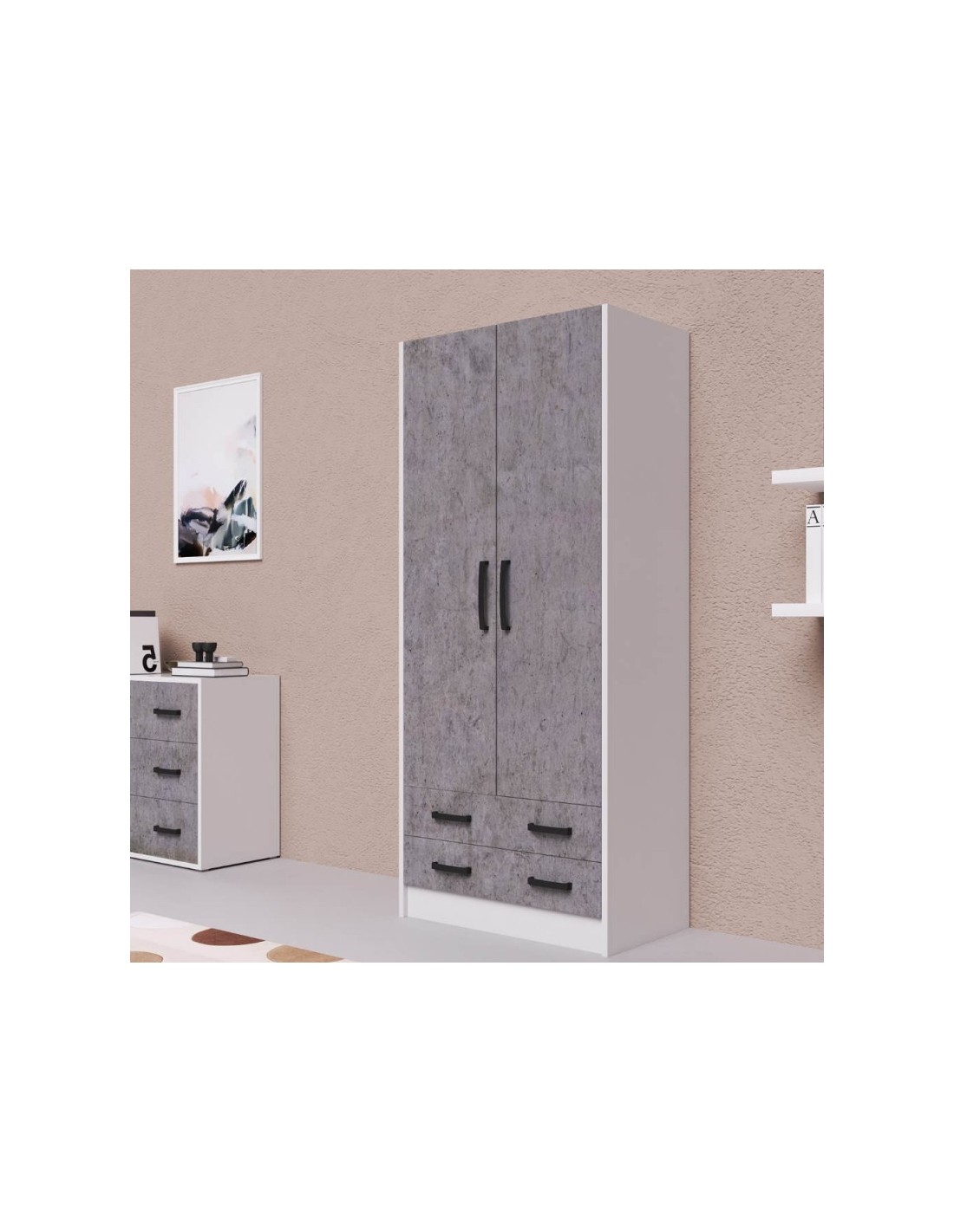 Semplice e utile armadio dotato di due ante e due cassetti. Ideale per stivare vestiti e maglie. I cassetti sono dotati di guide metalliche e rinforzo centrale. L'interno presenta una barra porta abiti, un ripiano e una base.