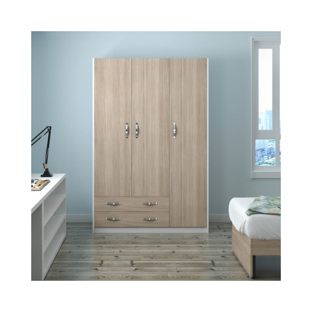 Semplice, capiente e solido sono i tre aggettivi di questo prodotto. Dotato di tre ante supportate da robuste cerniere e due cassetti con guide metalliche e supporto centrale. L'interno presenta due barre appendi abiti, tre ripiani e due basi dove riporre tutti i tuoi oggetti.