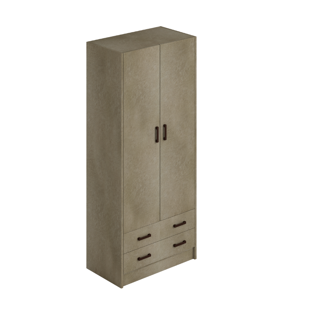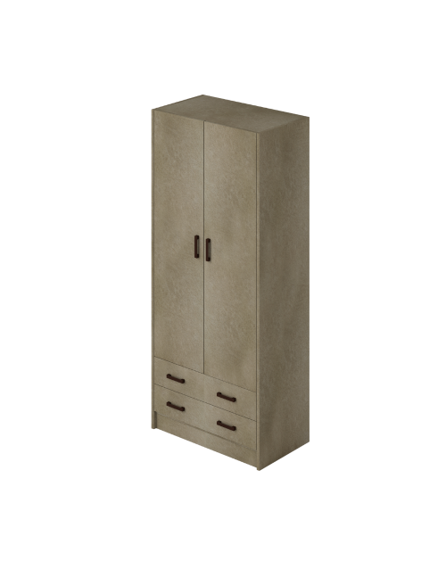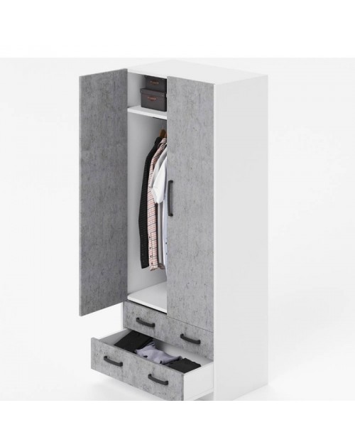 Semplice e utile armadio dotato di due ante e due cassetti. Ideale per stivare vestiti e maglie. I cassetti sono dotati di guide metalliche e rinforzo centrale. L'interno presenta una barra porta abiti, un ripiano e una base.