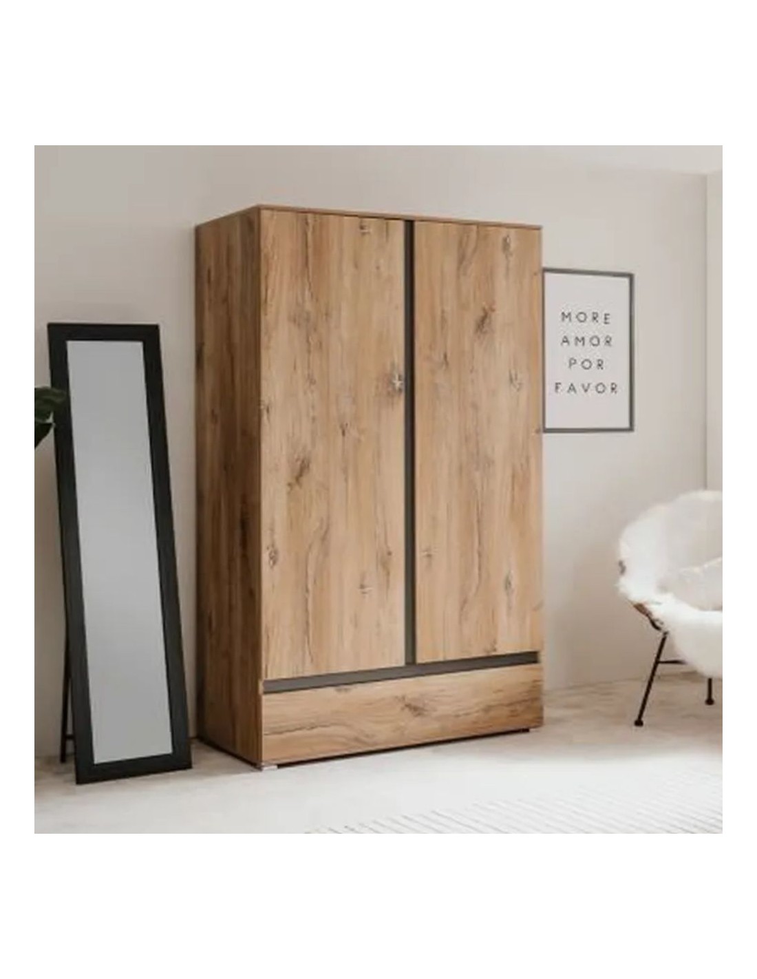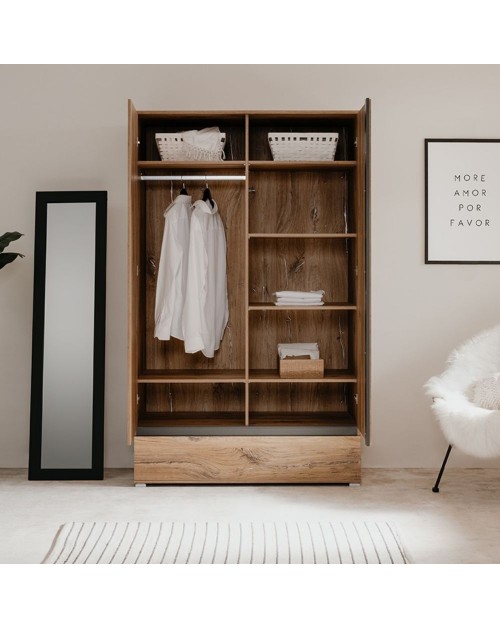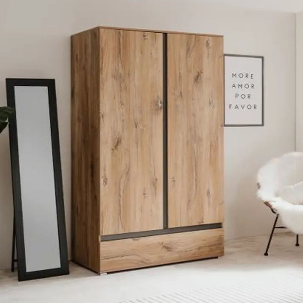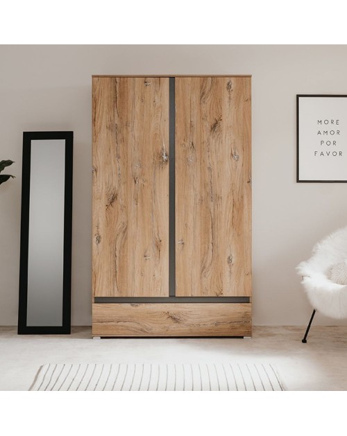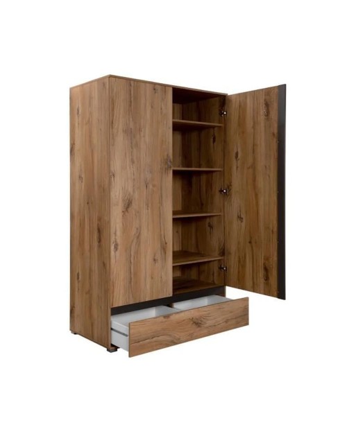 L'armadio Unna60A due ante nella finitura rovere antico, ti sorprenderà per la gestione interna dello spazio. E' dotato di asta appendiabiti, 6 ripiani e cassettone diviso in due parti. Potrai riporre facilmente tutti i tuoi vestiti avendo il tuo guardaroba sempre in ordine. Puoi posizionarlo in camera da letto, cameretta, ingresso oppure dove lo desideri. Il colore rovere antico con elementi antracite dona calore al tuo ambiente.