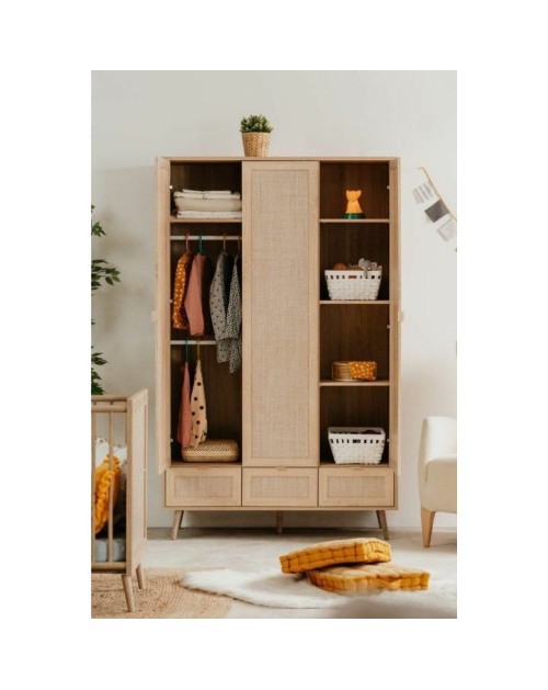 L'armadio 3 ante e 3 cassetti Bali60B si presenta in modo raffinato e dal colore caldo. E' dotato di 3 ante e 3 cassetti. Nella parte sinistra troviamo un comodo ripiano e 2 aste appendiabiti, mentre nella parte destra tre ripiani. La parte inferioriore è dotata di tre capienti cassetti. Si caratterizza per l'utilizzo di finiture naturali come le ante effetto vimini e la struttura nel colore quercia. Mobile ideale per chi vuole rendere originale ed unico ogni ambiente.