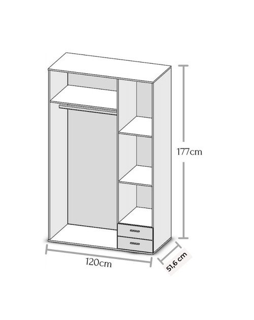 L’armadio 3 ante e 2 cassetti Seba3 è moderno e pratico. E’ realizzato in legno truciolato e offre 3 ante e 2 cassetti. Dietro alle ante centrali troviamo asta appendiabiti ed 1 ripiano. Dietro all' anta laterale invece ci sono 2 ripiani. Ideale per camere, camerette, corridoi e anche uffici.