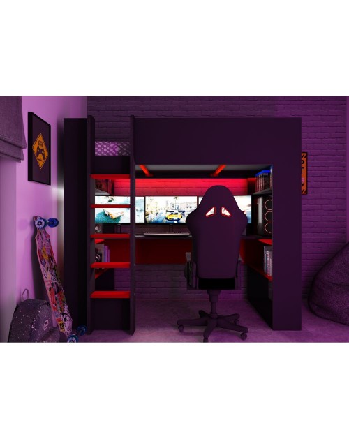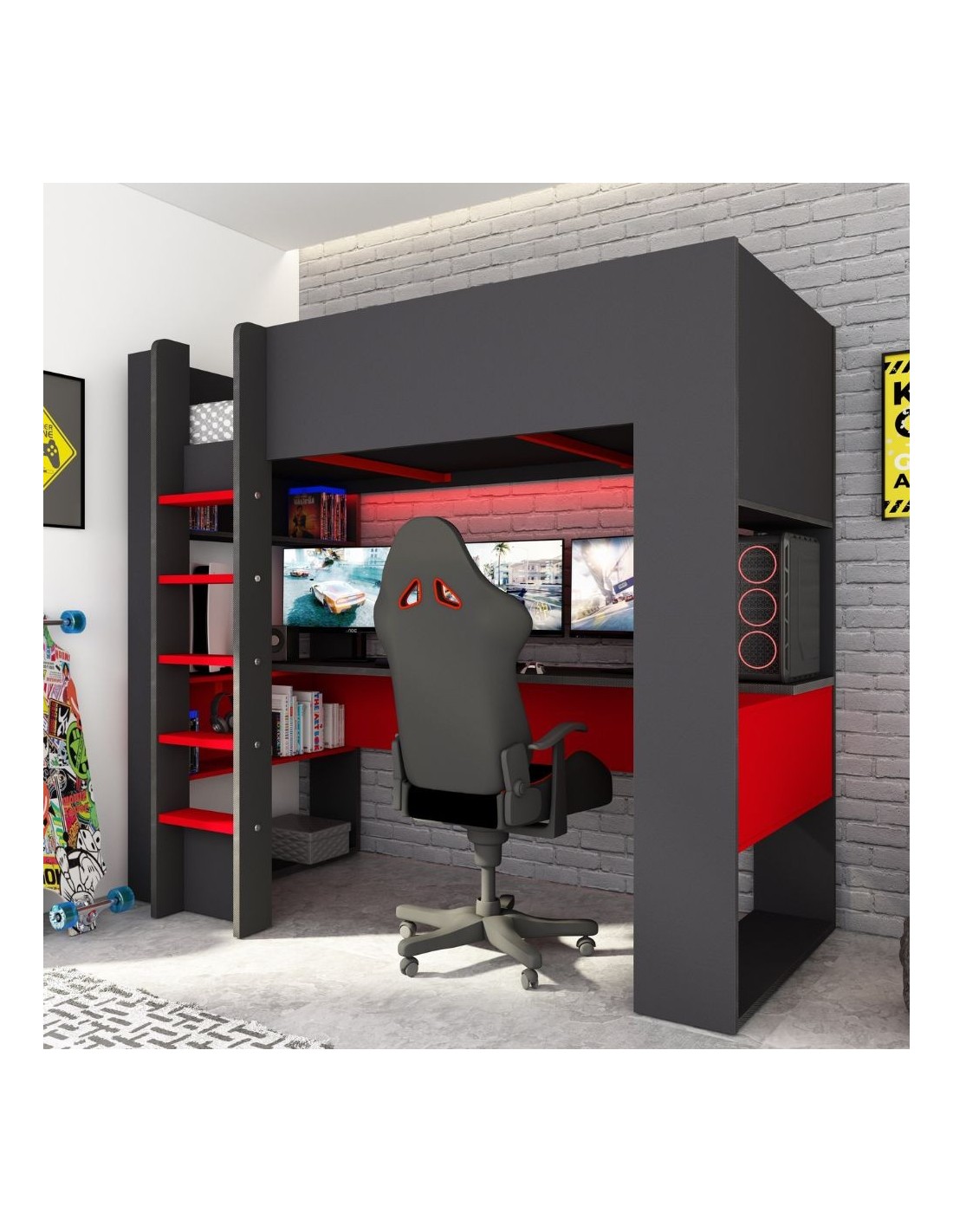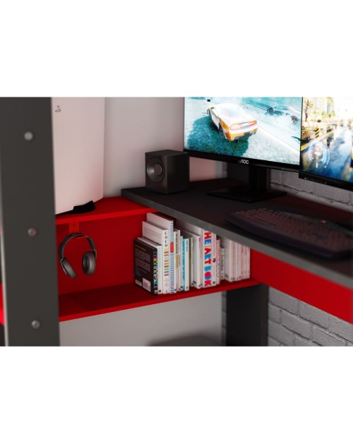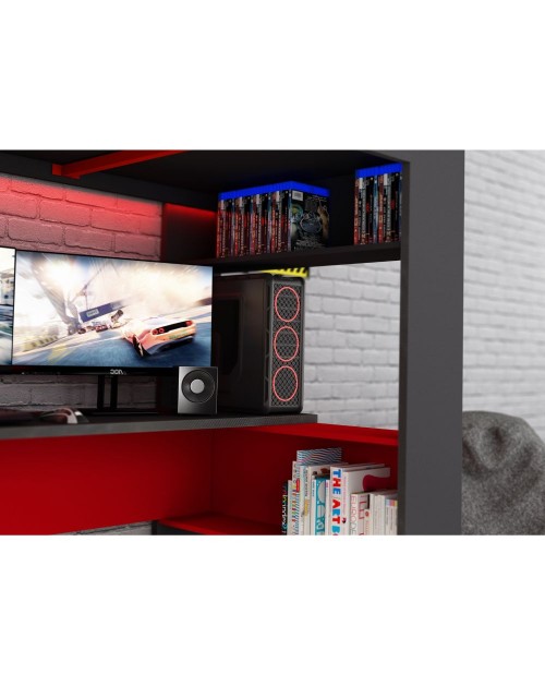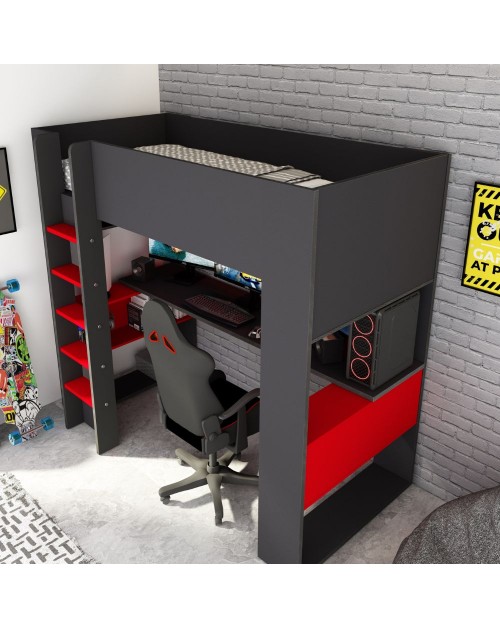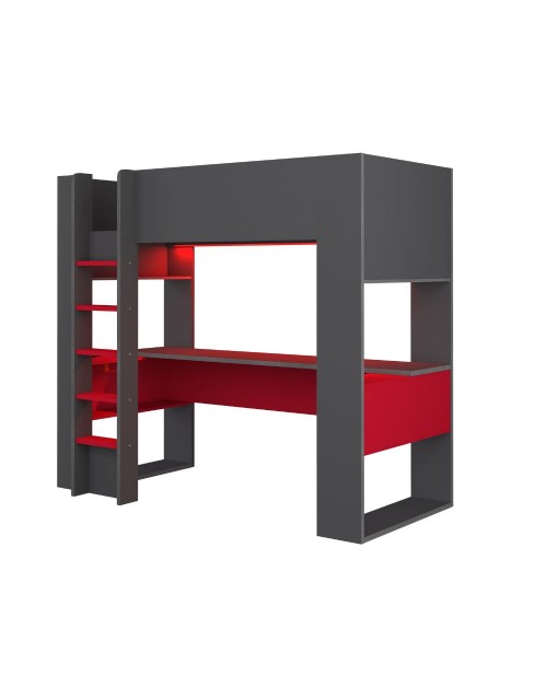 Il letto a castello nella finitura antracite e rosso 5050 è composto da letto, scrivania e vari ripiani dove riporre libri e tanto altro. Soluzione salvaspazio per arredare la cameretta in modo funzionale.