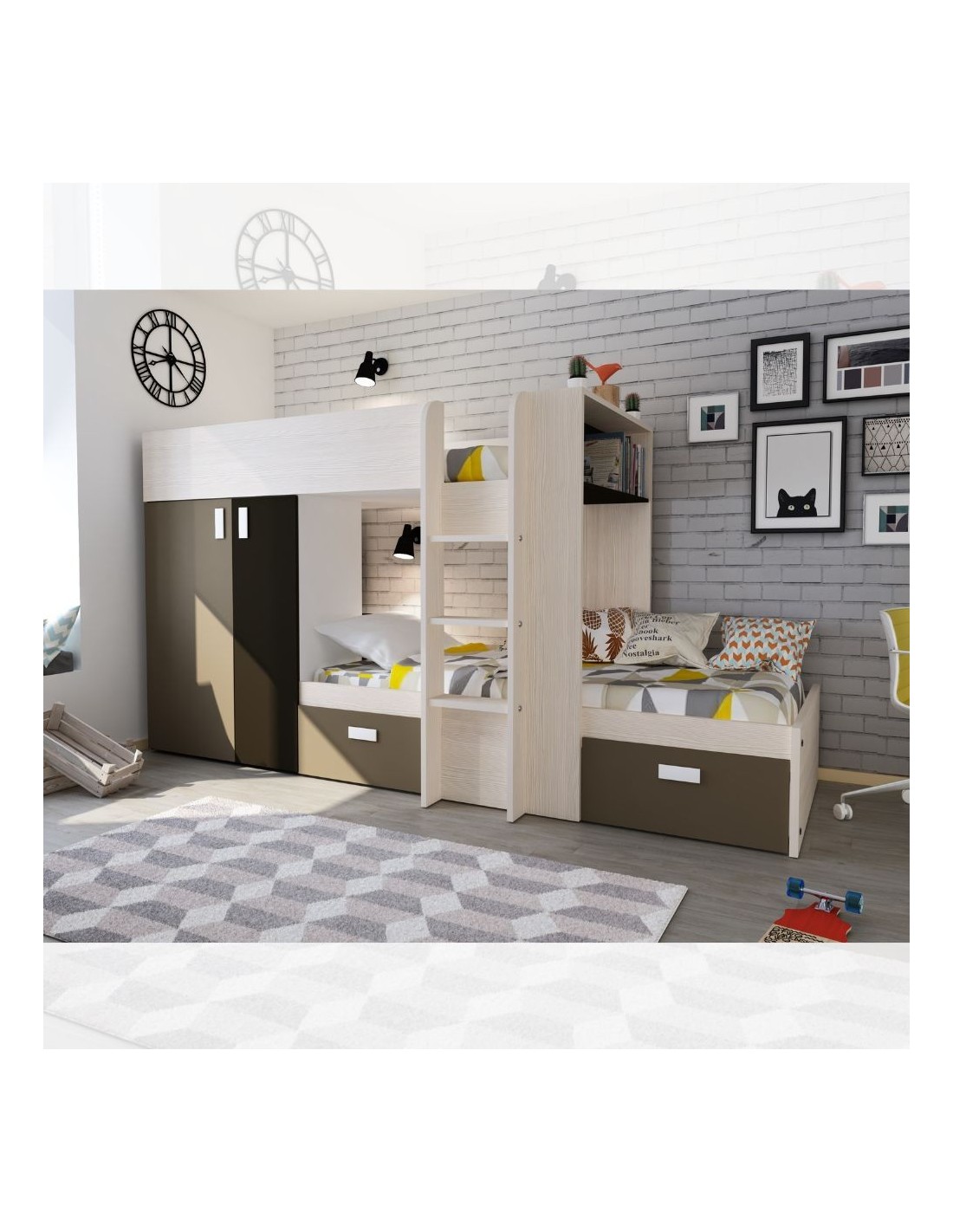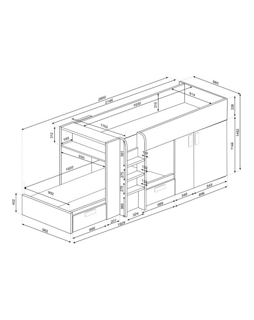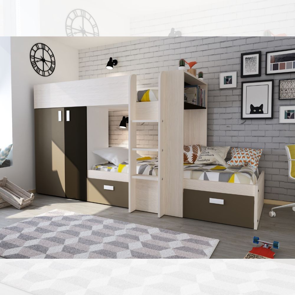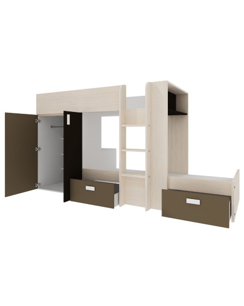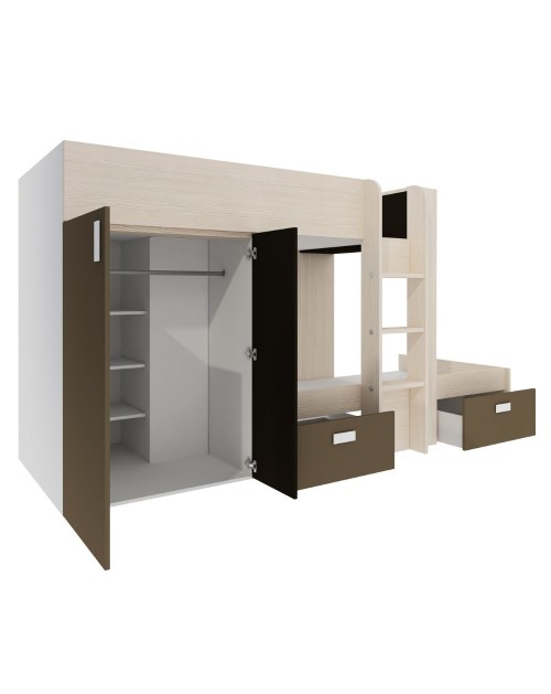 L’armadio è composto da due ante con barra appendiabiti e 3 ripiani interni. Il letto in basso presenta un vano che puoi usare come comodino o libreria. I due cassetti estraibili sono capienti e robusti, quindi perfetti per biancheria da letto, vestiti e altro.