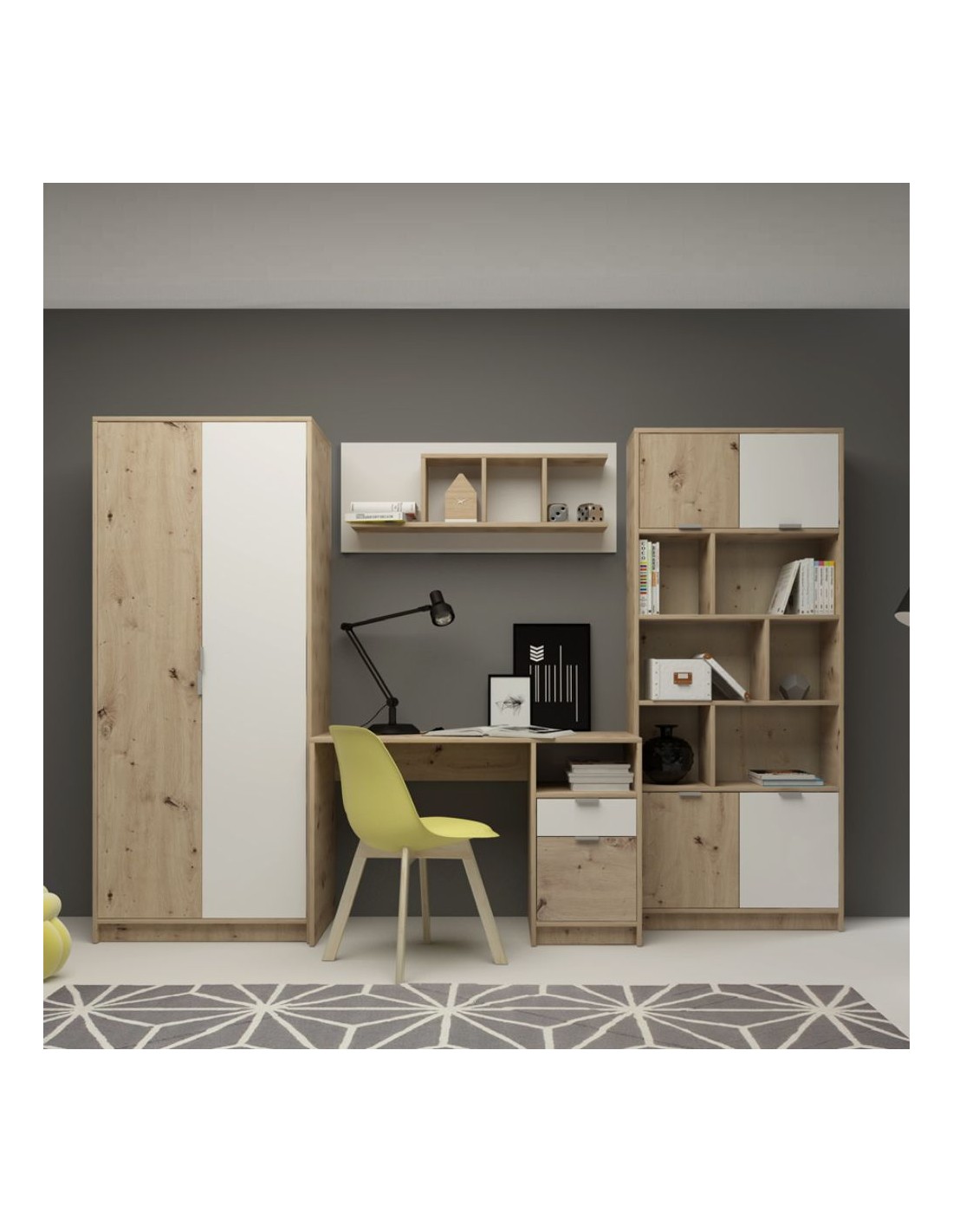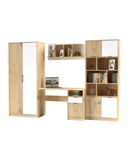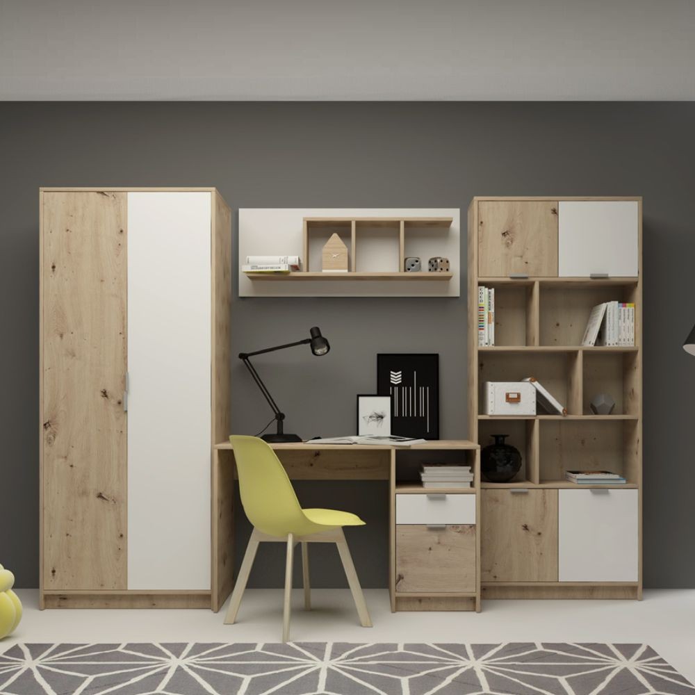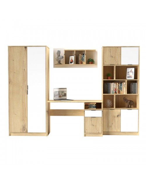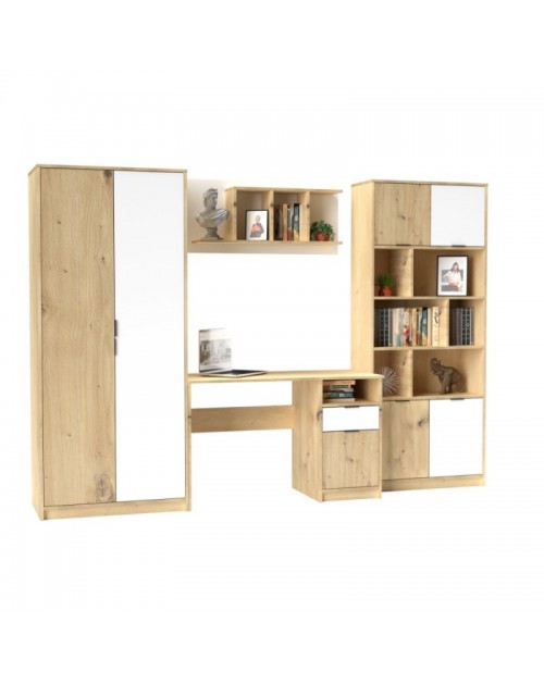 La parete attrezzata per cameretta con scrivania rovere bianco Gap System è un set composto da 4 mobili che comprende: un armadio a due ante, una scrivania, una mensola da muro e una libreria.