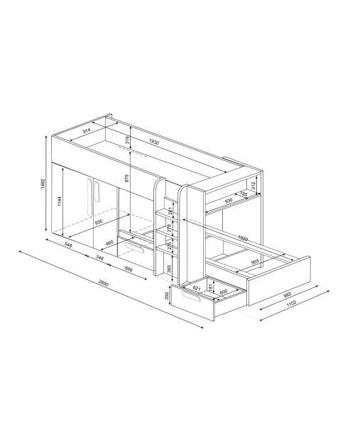 L’armadio è composto da due ante con barra appendiabiti e 3 ripiani interni. Il letto in basso presenta un vano che puoi usare come comodino o libreria. I due cassetti estraibili sono capienti e robusti, quindi perfetti per biancheria da letto, vestiti e altro.