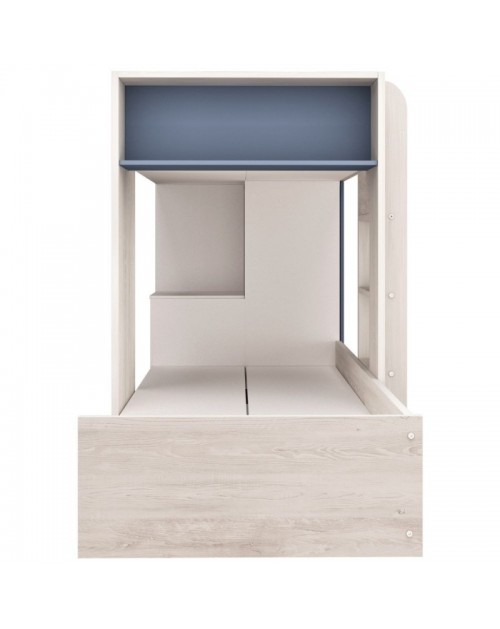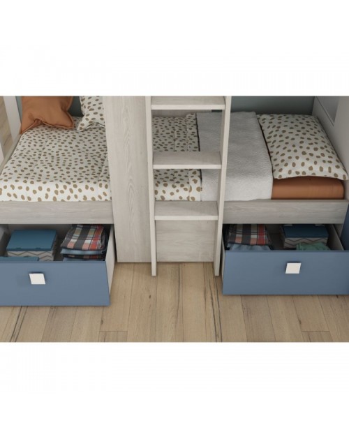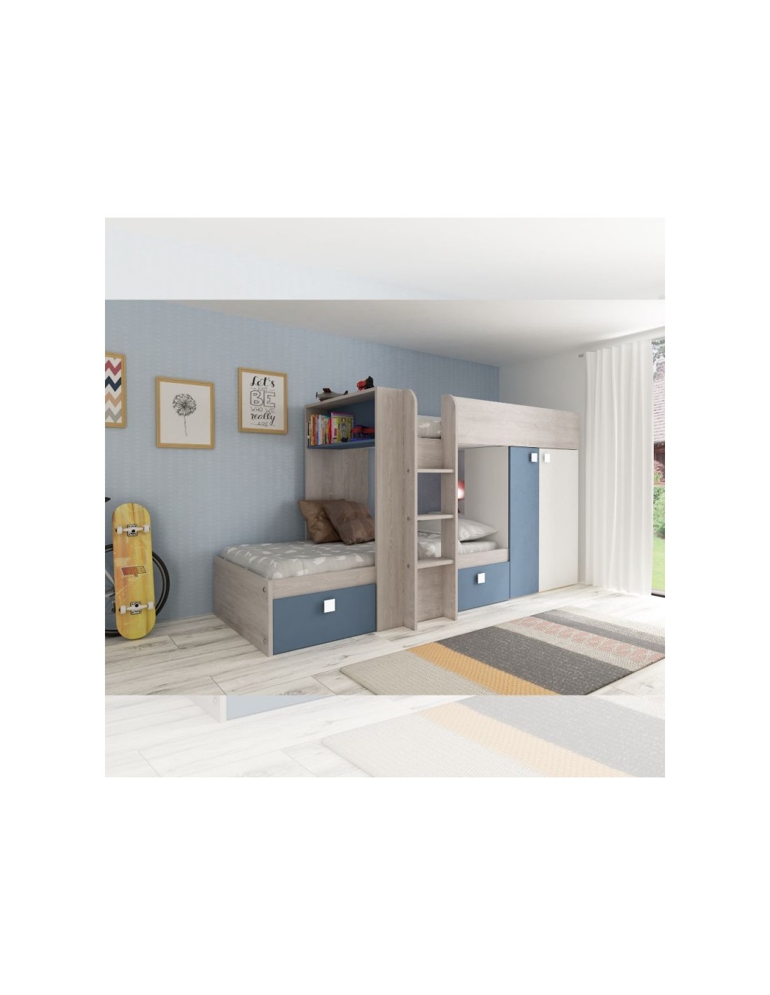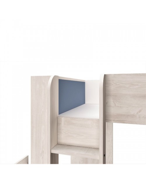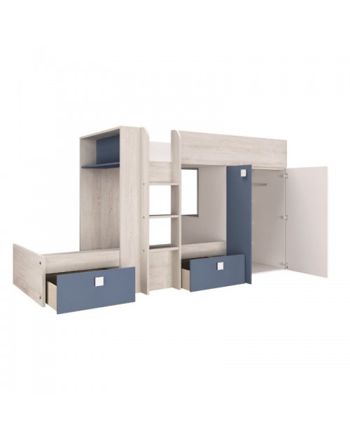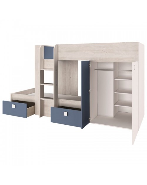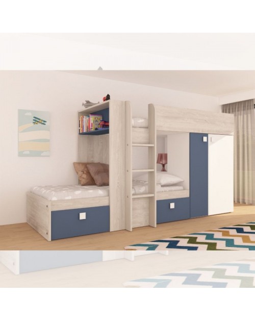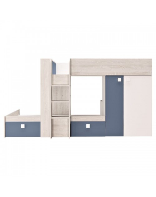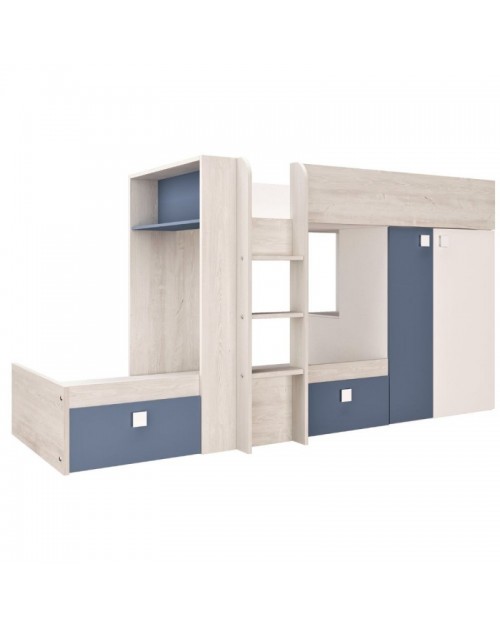 Il letto a castello 1260 nella finitura bianco vintage e blu offre soluzioni pratiche ed originali per arredare la tua cameretta. Presenta un doppio letto sfalsato, oltre a due cassetti estraibili e un armadio a due ante.