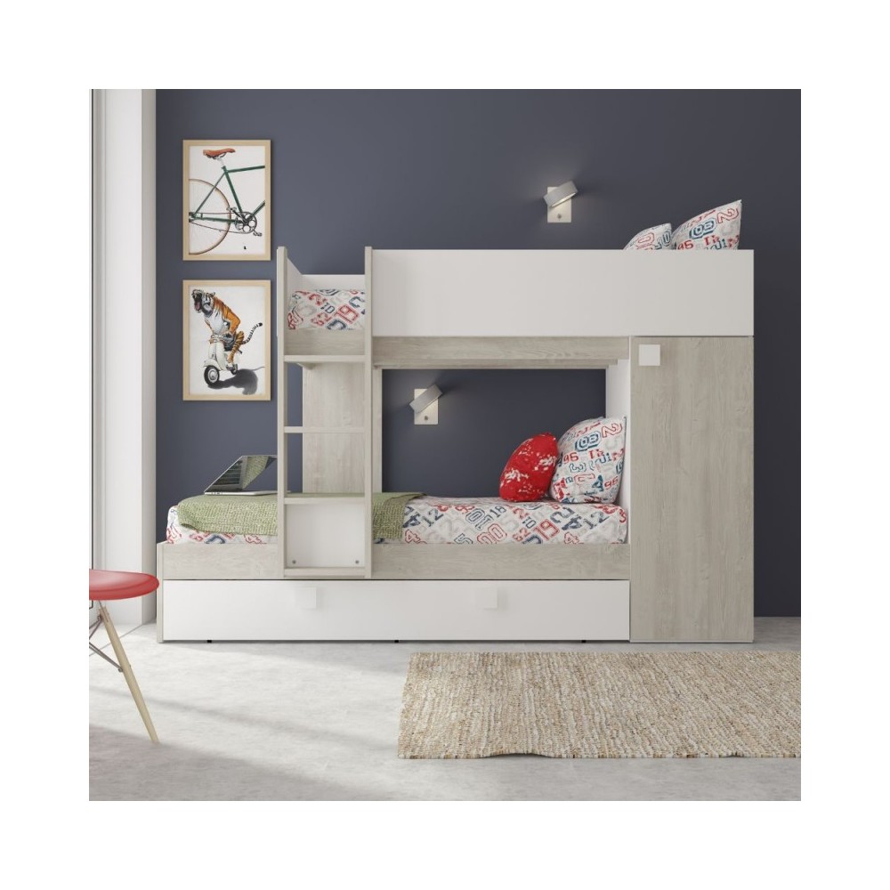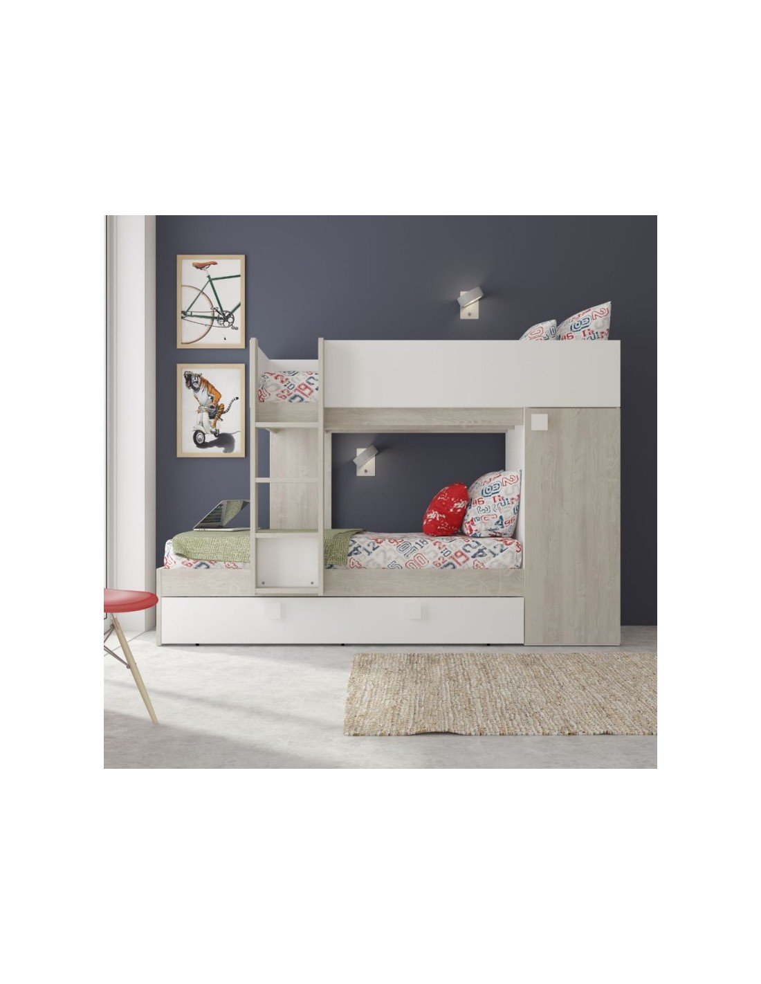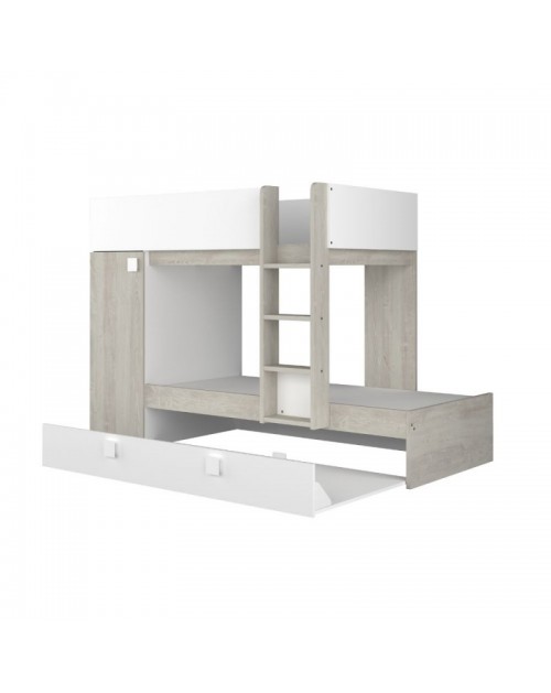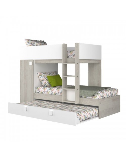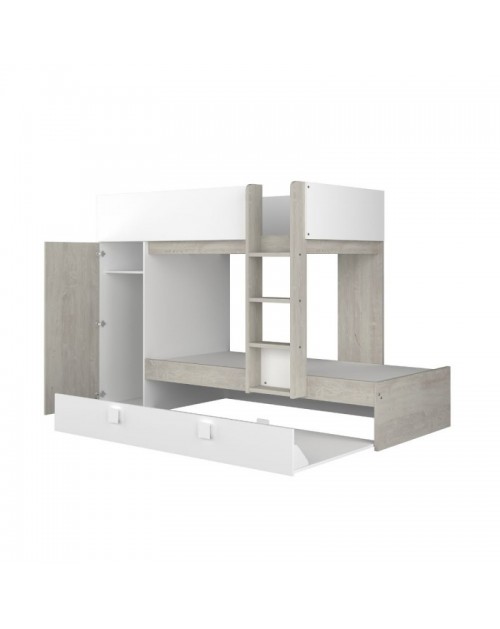 Il letto a castello bianco consumato e bianco è la soluzione salvaspazio per avere 3 letti in una stanza. E’ composto da 2 comodi letti e un funzionale letto estraibile con ruote. Inoltre troviamo un capiente armadio con anta, ripiano e asta appendiabiti. I letti sono sfalsati in modo da ottenere più visibilità e l’armadio funge da supporto per il letto superiore. I bambini di 3 anni possono dormire nel letto estraibili, quelli di 4 in quello inferiore e quelli dai 6 anni in poi su quella superiore. La composizione è reversibile e può essere montata in modo speculare.