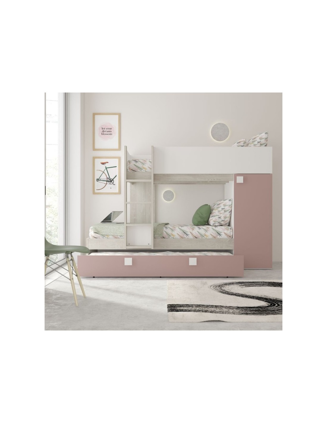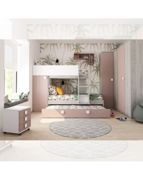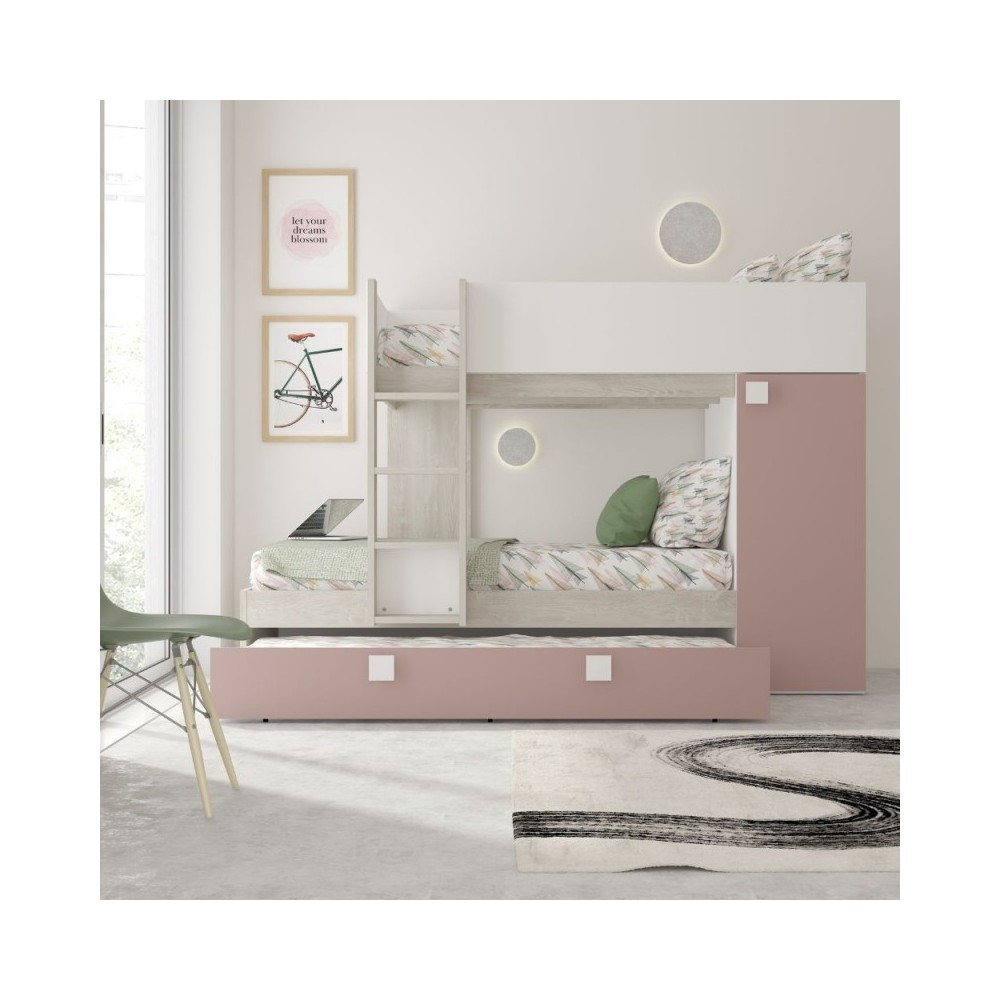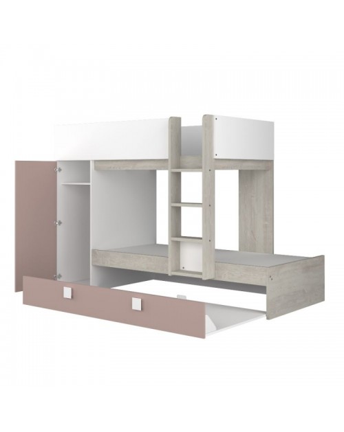 Il letto a castello bianco consumato e rosa antico è la soluzione salvaspazio per avere 3 letti in una stanza. E’ composto da 2 comodi letti e un funzionale letto estraibile con ruote. Inoltre troviamo un capiente armadio con anta, ripiano e asta appendiabiti. I letti sono sfalsati in modo da ottenere più visibilità e l’armadio funge da supporto per il letto superiore. I bambini di 3 anni possono dormire nel letto estraibili, quelli di 4 in quello inferiore e quelli dai 6 anni in poi su quella superiore. La composizione è reversibile e può essere montata in modo speculare.