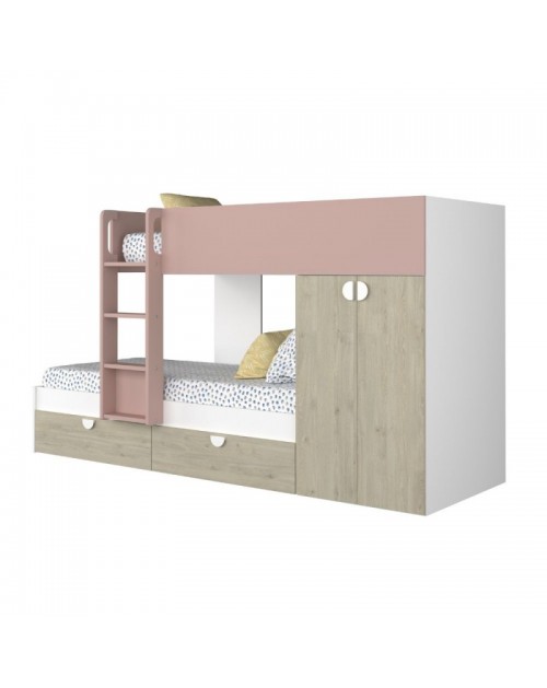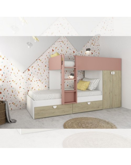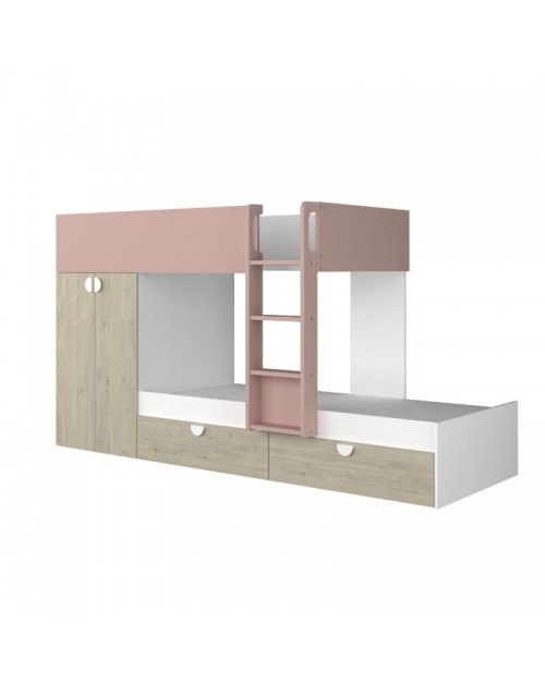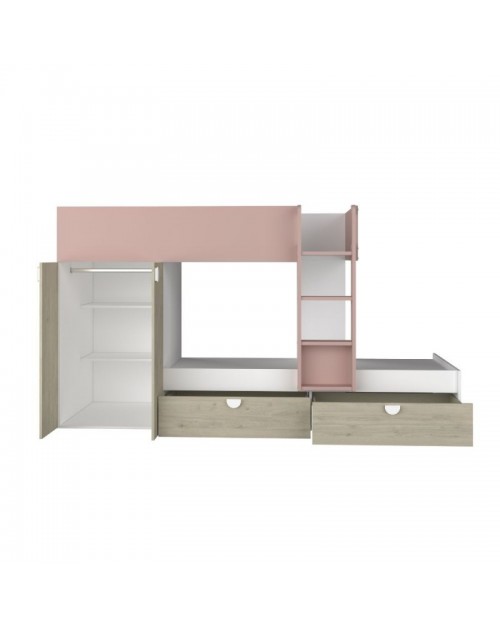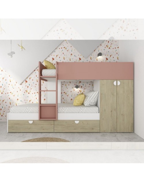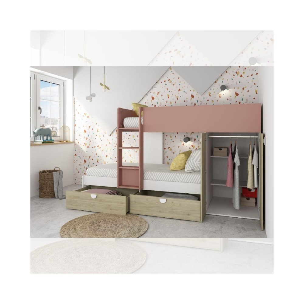 Letto a castello rovere e rosa antico con armadio 2 ante e cassetti