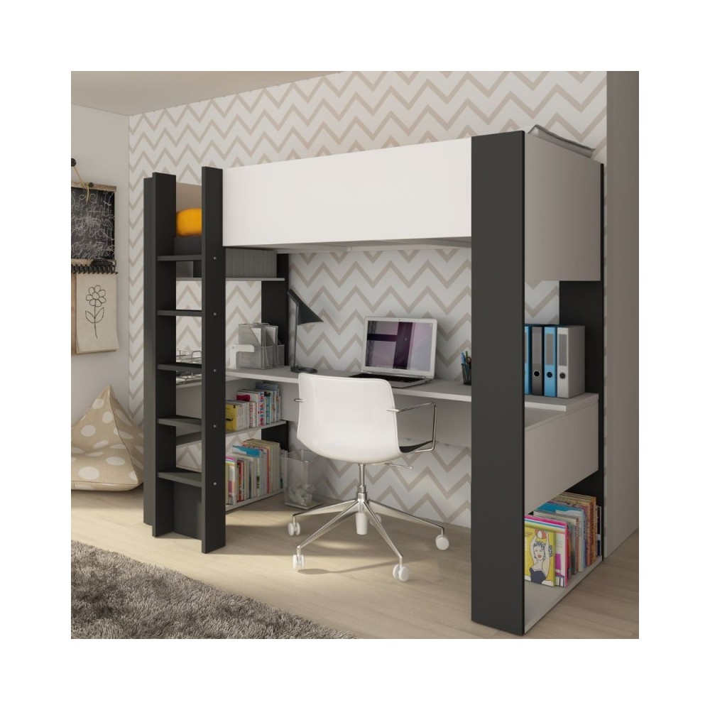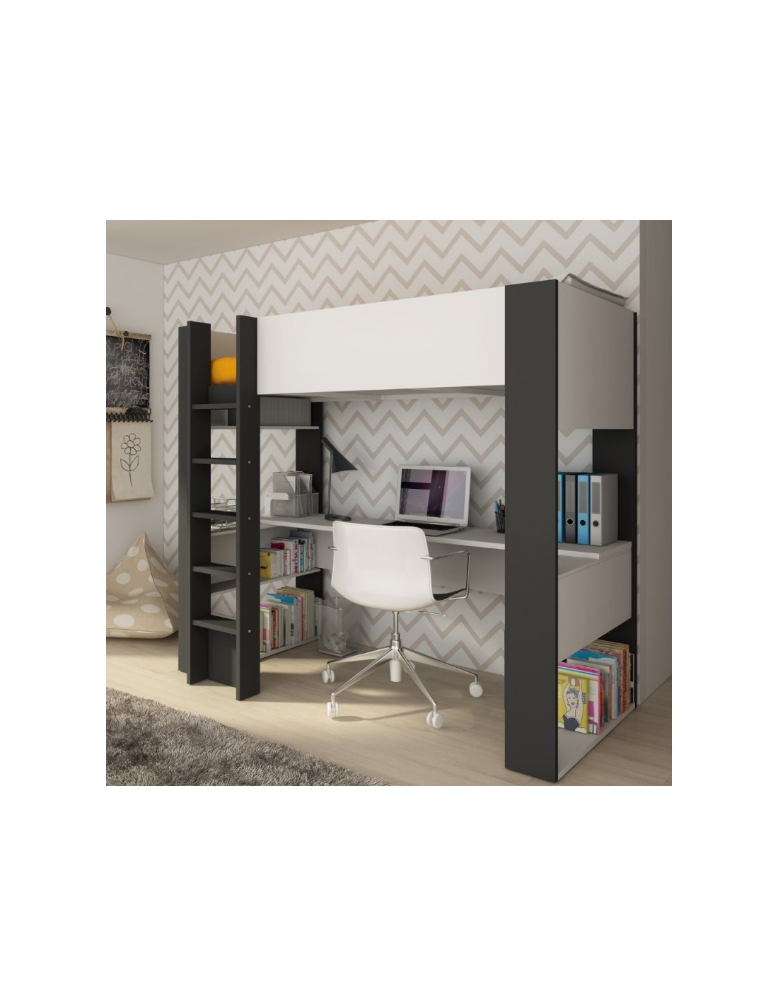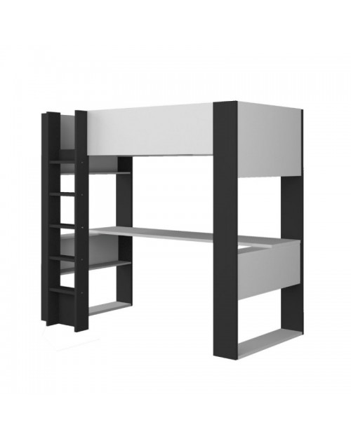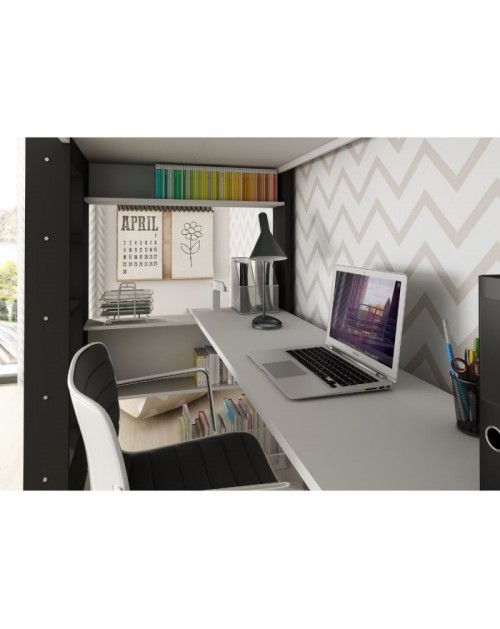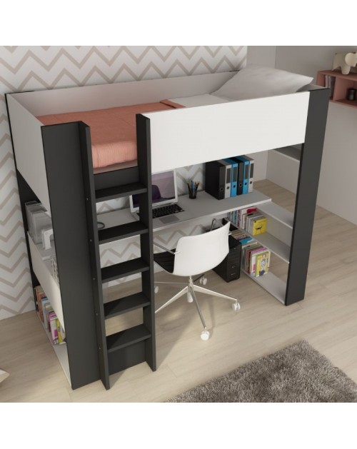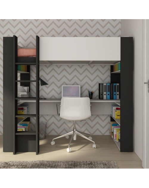 Il letto a soppalco 1651 antracite e bianco è la soluzione originale e moderna per arredare in modo intelligente la cameretta del tuo bambino. E’ composto da letto superiore, una scrivania, due ripiani multiuso, due vani a giorno ed una scala. Molto generoso il piano della scrivania che ti consentirà di appoggiare tv, computer, consolle giochi e tanto altro. Comodi i due ripiani e i due vani a giorno per posizionare libri ed oggetti vari. Il letto superiore ha una portata massima di 75 kg e non necessita di rete a doghe in quanto c'è una solida base letto. La composizione è reversibile e può essere montata in modo speculare.