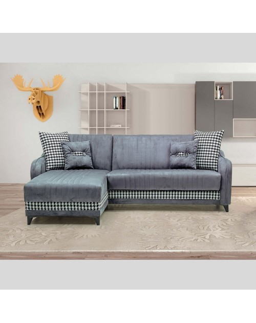 Divano con penisola contenitore, adatto per arredare il tuo salotto o soggiorno. Pratica la penisola reversibile in modo da non essere vincolati qualora si volesse cambiare la disposizione dei mobili. Infatti può essere montata sia destra che sinistra. Il rivestimento è facile da pulire con un panno umido.