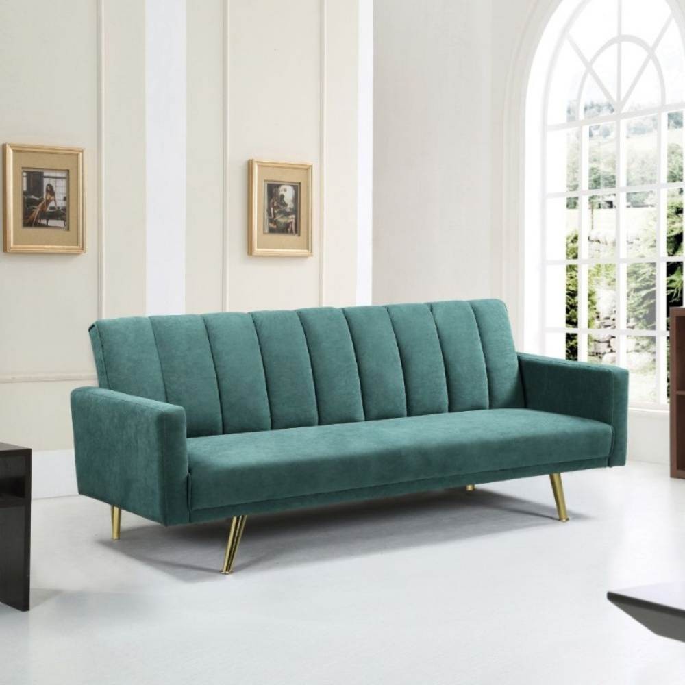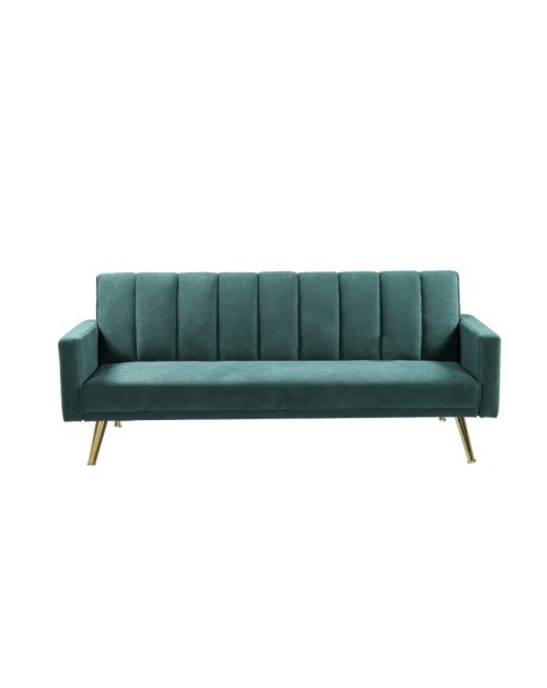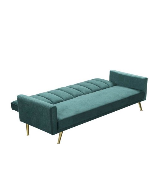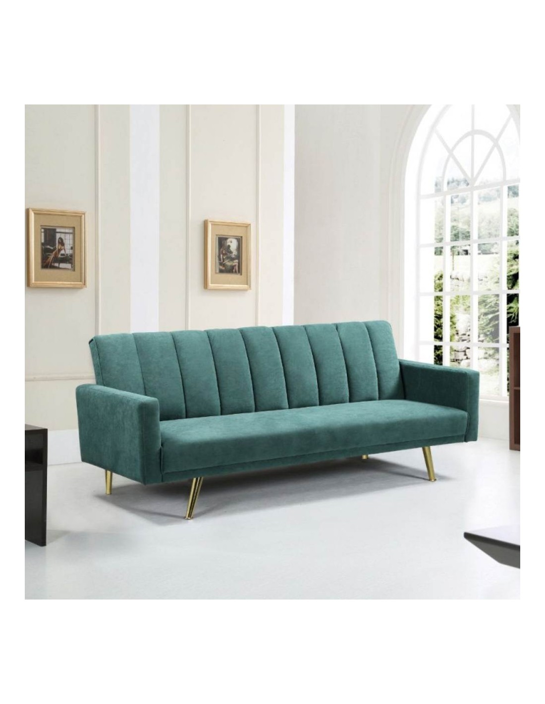 Il divano letto Issik verde, grazie alla sua apertura a libro, in pochi secondi può trasformare il tuo living oppure il tuo studio, in una camera da letto per accogliere i tuoi ospiti. Il divano è imbottito in gommapiuma ad alta densità, comoda ed indeformabile. Mentre il rivestimento è in tessuto con schienale che presenta linee verticali trapuntate. Molto particolari i piedi in metallo colore oro.