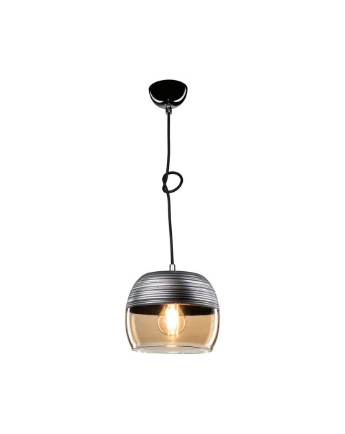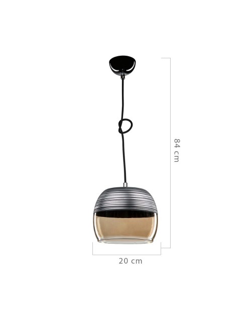 La lampada si caratterizza per la particolare forma di bicchiere rovesciato con decoro nero nella parte alta e vetro fumè in quella bassa.