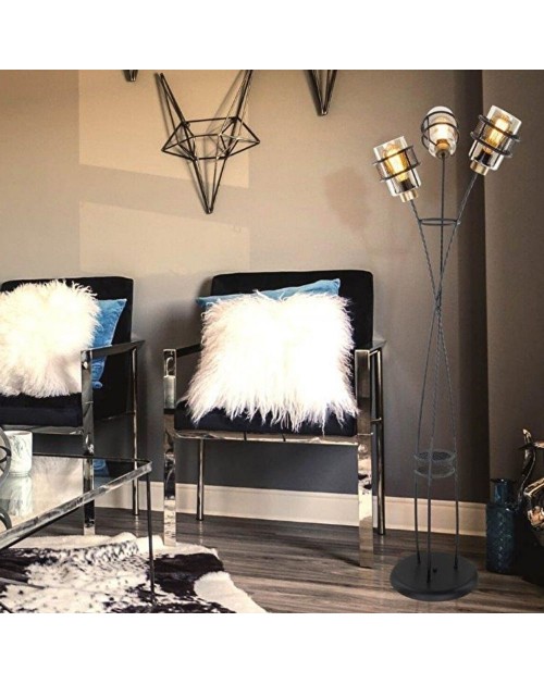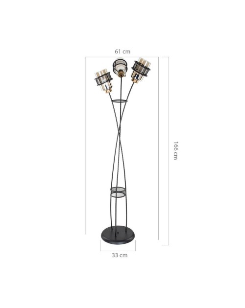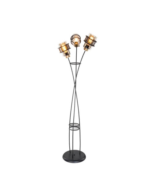 Lampada da pavimento composta da uno scheletro in ferro effetto intrecciato e 3 luci in vetro fumè protette da una gabbia in lamiera stampata. Le 3 luci diffondono la luce in tre punti diversi creando riflessi armoniosi in tutto l'ambiente. Prodotto idelae per il tuo ufficio, il living oppure accanto alla tua poltrona.