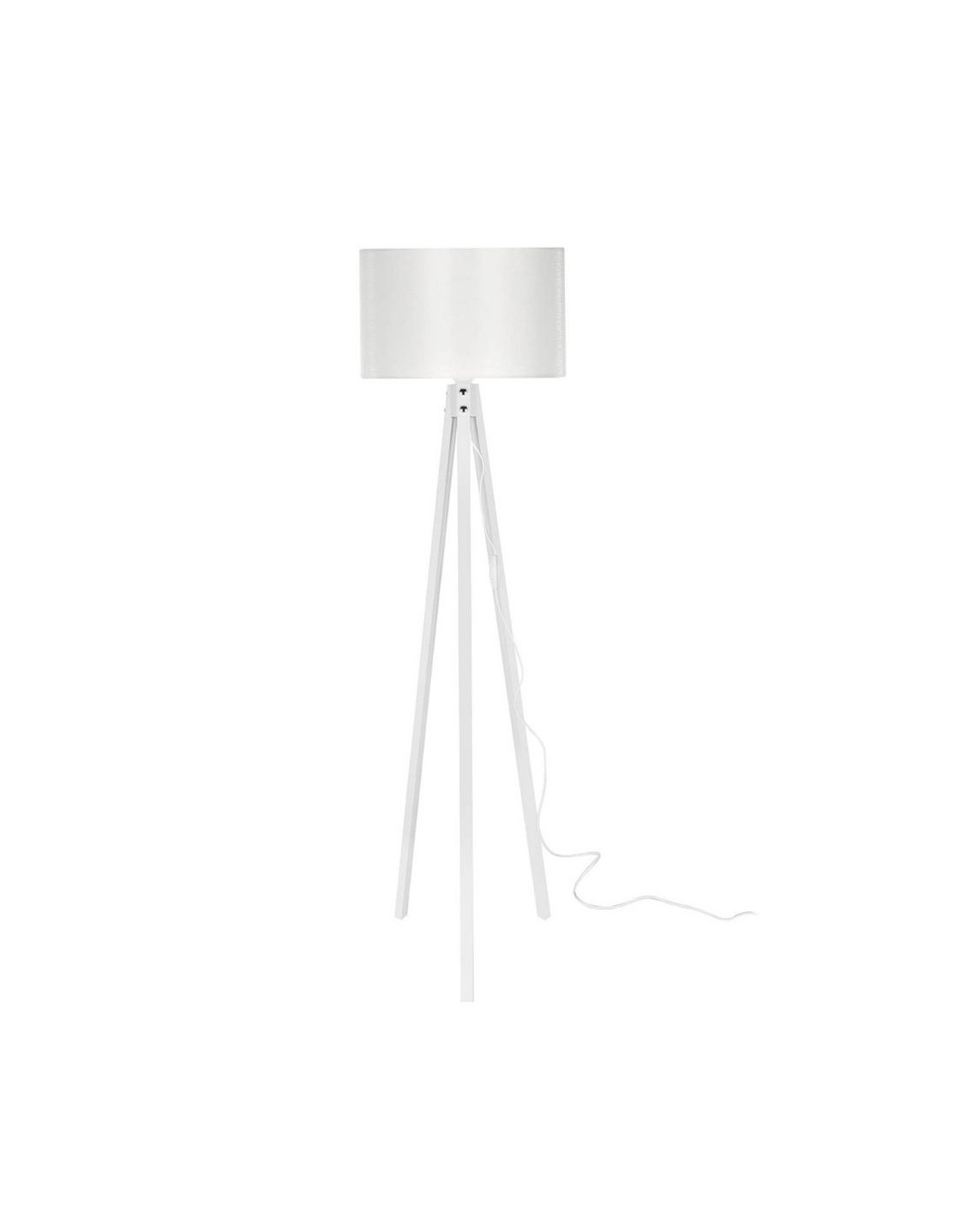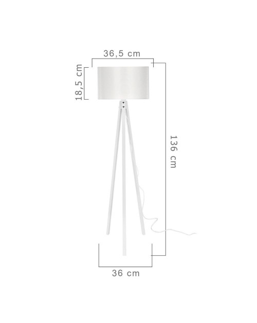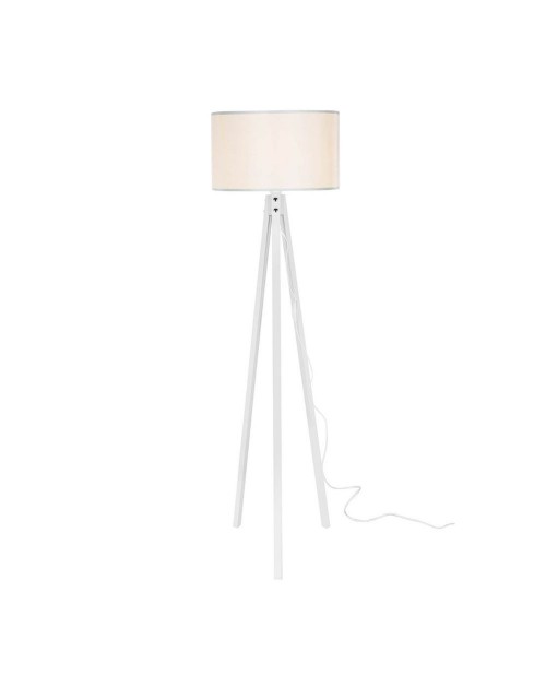 Lampada da terra composta da treppiede e paralume in tessuto bianco.
