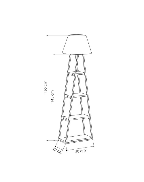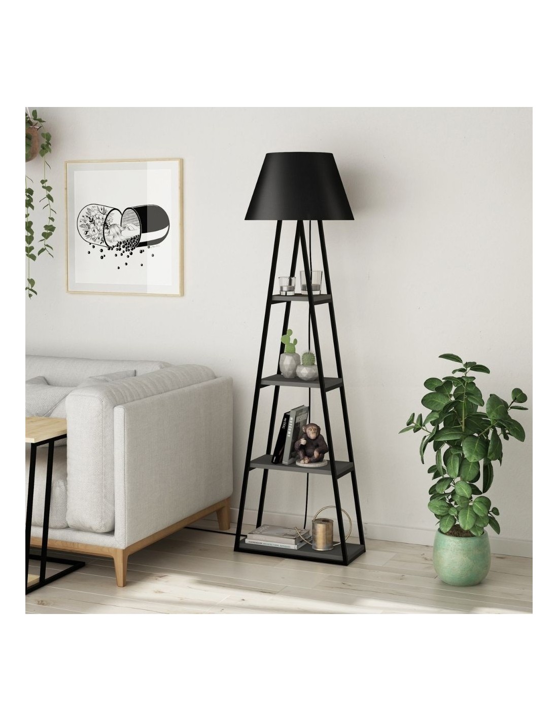 Lampada dal design unico. La piantana è composta da una struttura in metallo nero su cui poggiano mensole di diversa misura colore antracite. Potrai usala come libreria per appoggiare tutti gli oggetti che vuoi. Nella parte superiore invece è caratterizzata da un ampio paralume in tessuto di colore nero Puoi posizionarla nel tuo living, nello studio oppure all'ingresso.