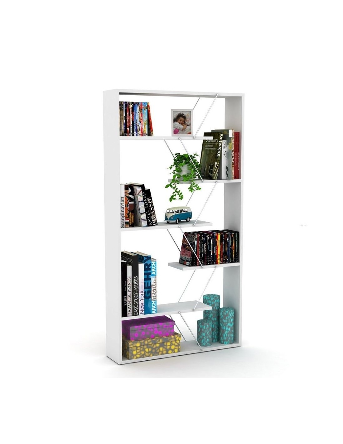 Libreria di design ma allo stesso tempo molto pratica e funzionale. I ripiani sono supportati da eleganti aste in metallo, creando un vivace gioco geometrico.