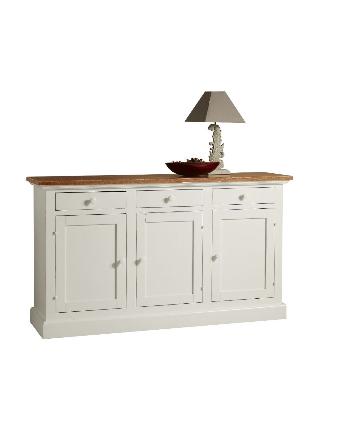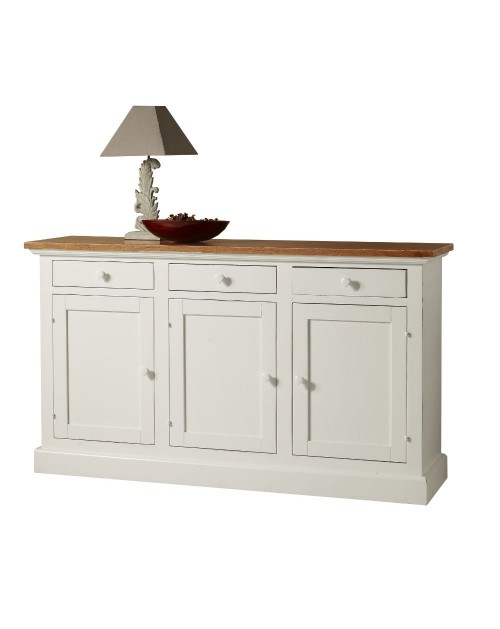 Straordinaria credenza in legno in stile shabby chic composta da 3 ante e 3 cassetti. La struttura bianco laccato e il piano a contrasto, frassino spazzolato e sbiancato, renderanno unici i tuoi ambienti. Nelle tre generose ante fornite di ripiano, potrai posizionare stoviglie e biancheria. Mentre nei 3 comodi cassetti, troveranno spazio posate e tanto altro.