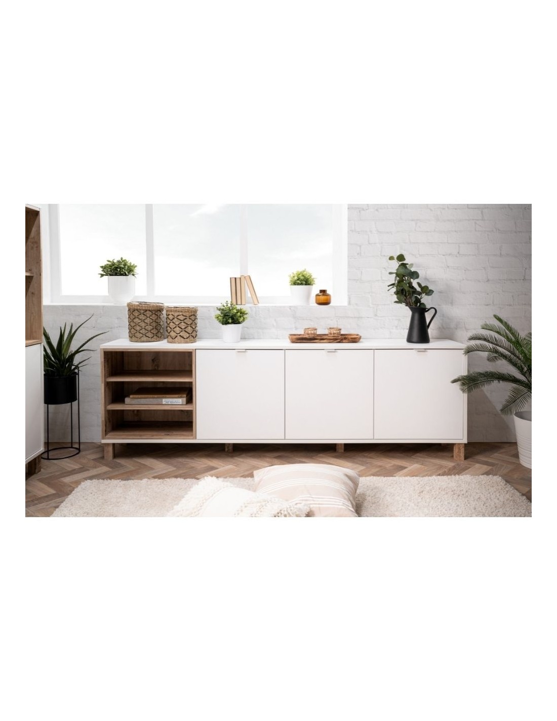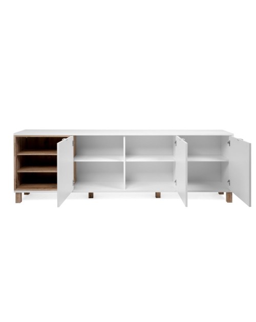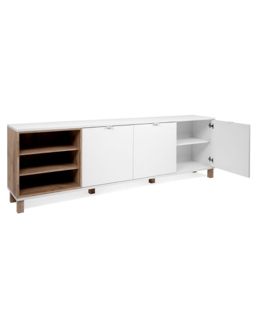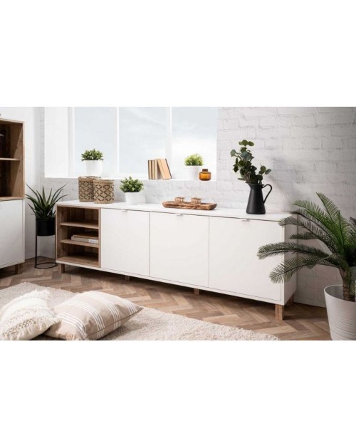 Madia moderna caratterizzata dal forte stile scandinavo. Grazie alle tre generose ante potrai riporre in modo ordinato tutti i tuoi oggetti. Il vano a giorno risulterà comodo per libri o dispositivi elletronici.Il binomio cromatico bianco rovere naturale rende questo mobile di facile abbinamento a tutti i tuoi ambienti. Puoi posizionarla nel tuo living oppure in cucina. Struttura robusta creata per durare nel tempo.