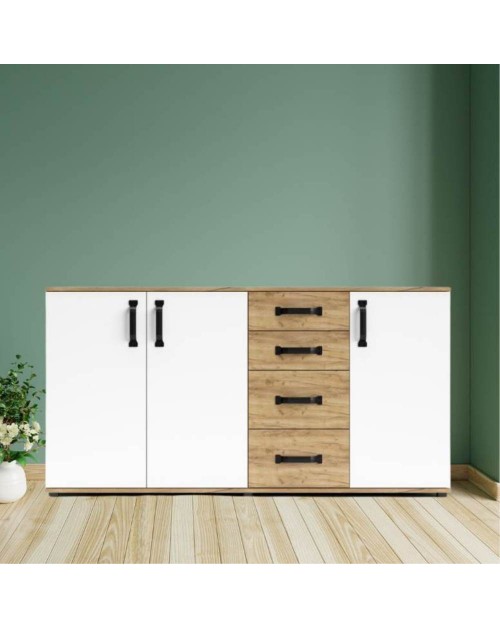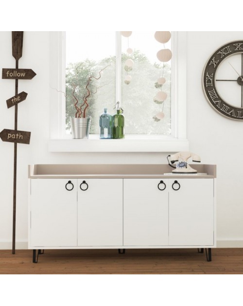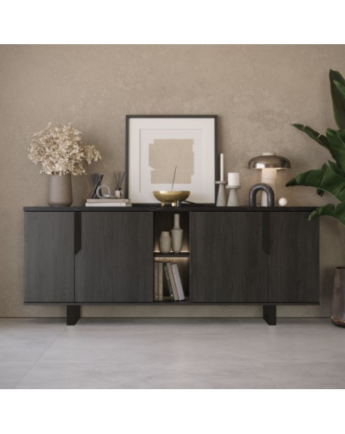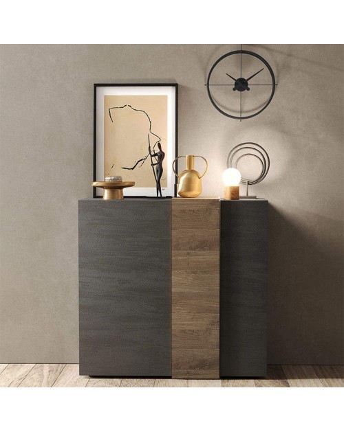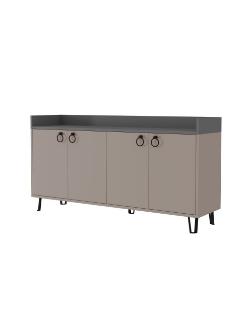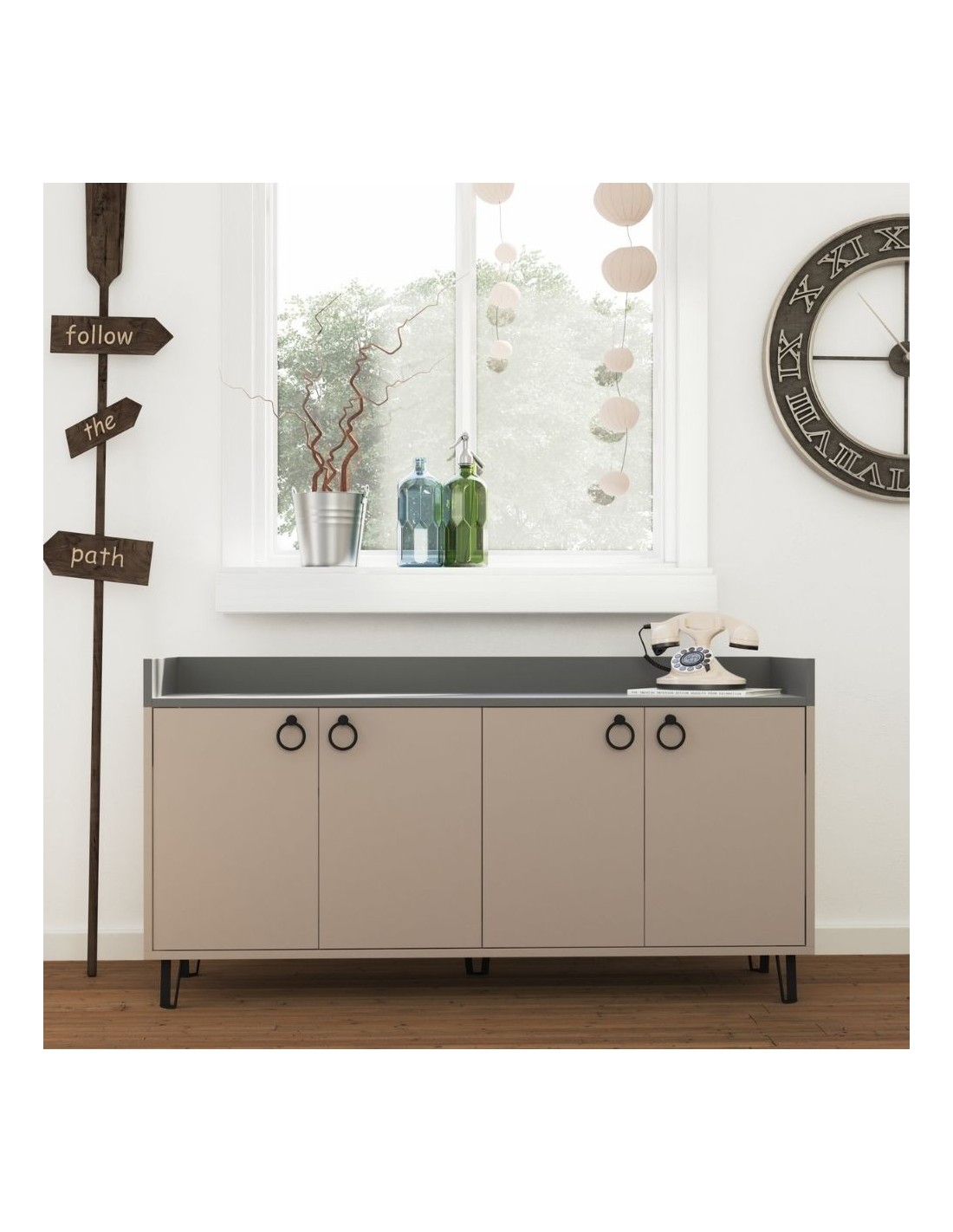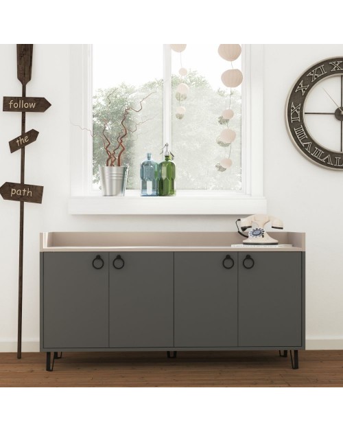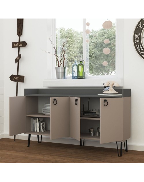 La madia Dea 4 ante tortora e antracite è capiente e funzionale. Il binomio cromatico la rende facilmente abbinabile a tutti gli stili e ambienti. Le linee moderne si fondono con particolari classici come le maniglie e la cornice sul ripiano superiore. I due ripiani interni ti aiuteranno a conservare i tuoi prodotti in modo ordinato. Puoi posizionarla in cucina oppure in salotto, il suo design unico non passerà inosservato.