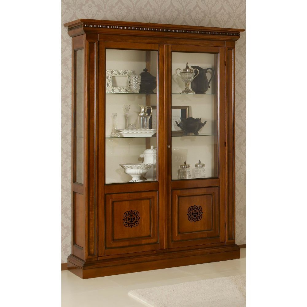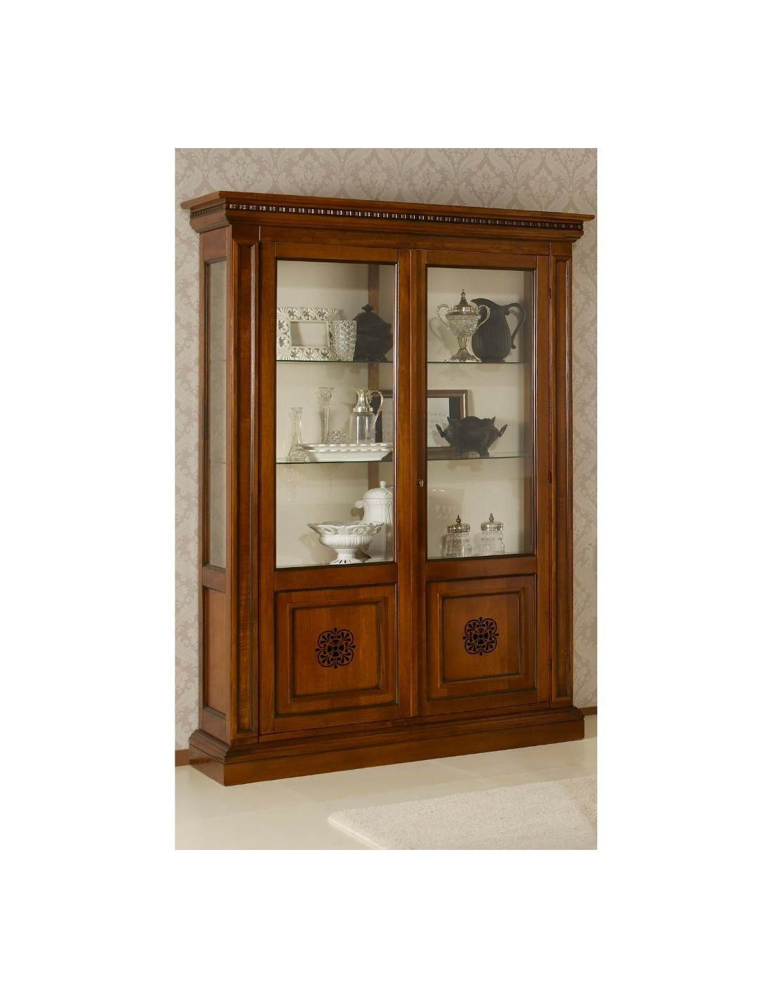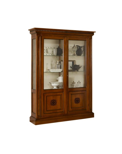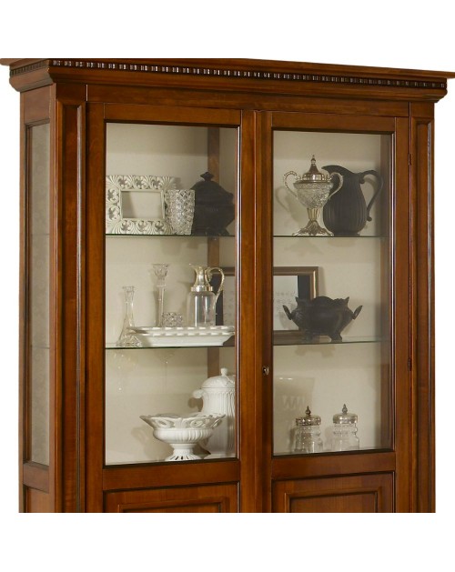 Luminosa cristalliera dotata di 2 ante e ripiani in vetro. La caratteristica principale è sicuramente il decoro traforato delle ante ma oltre ad essere elegante, questa cristalliera è anche molto funzionale. Nella parte alta troviamo ante in vetro, mentre in quella bassa in legno con decoro traforato. La stessa cosa si ripete sui fianchi caratterizzati da vetro nella parte superiore e legno in quella inferiore. In dotazione due ripiani in vetro e ripiano in legno. Struttura molto solida e robusta, creata per durare nel tempo.