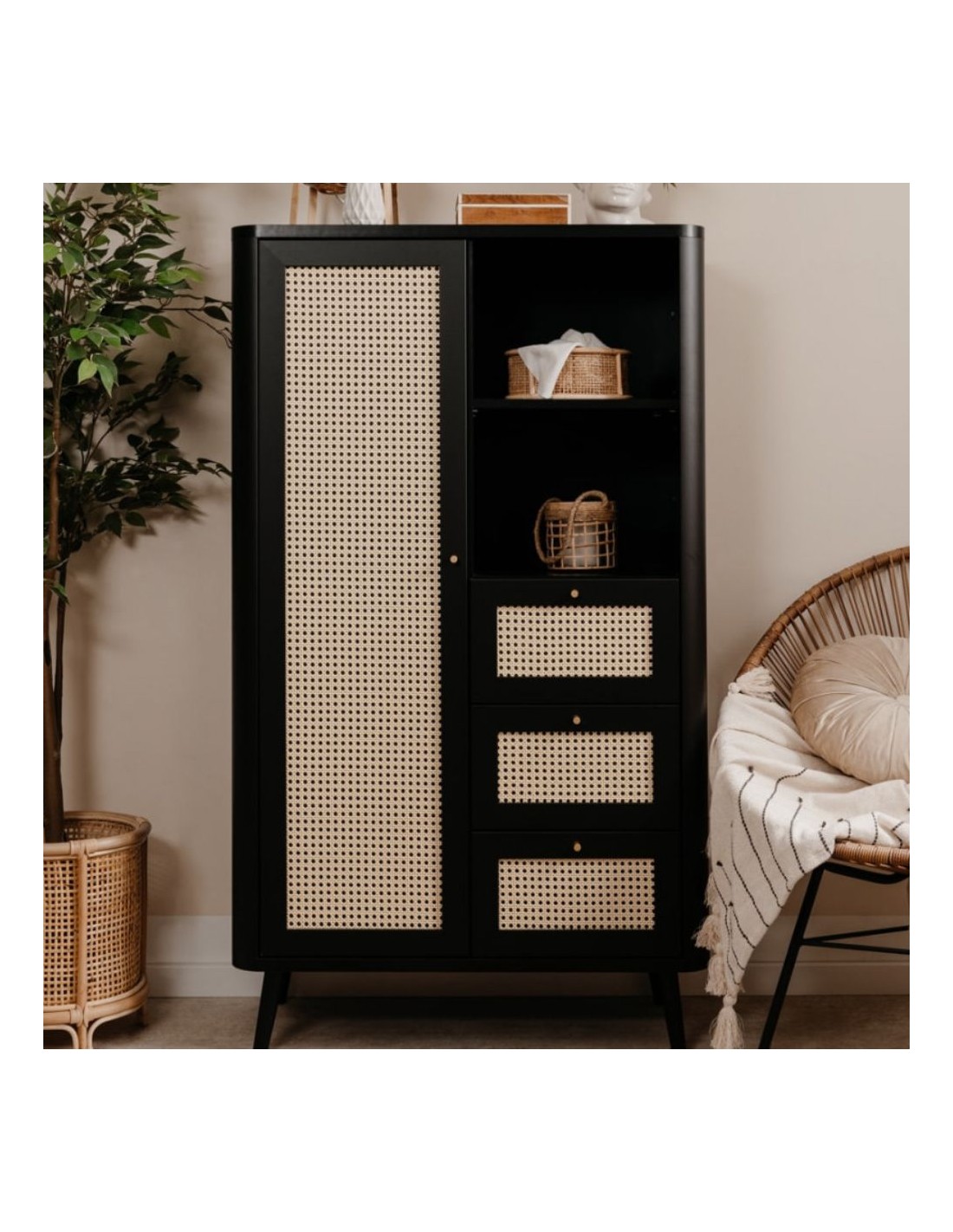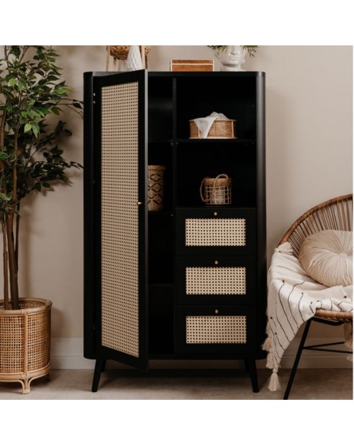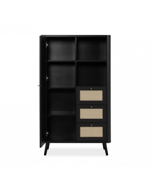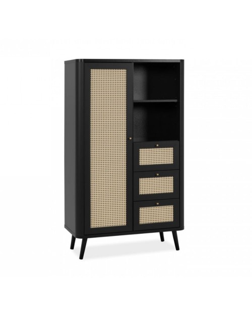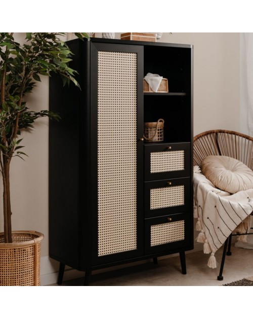 La credenza Kuta53 con 3 cassetti, 1 anta e vano giorno, renderà esotico e caldo il vostro ambiente. L'utilizzo di finiture naturali come le ante effetto rafia e la struttura nel colore nero sono le caratteristiche principali di questa credenza alta. Gli spazi sono ben concepiti ed è possibile avere tutto in ordine grazie ai 3 ripiani, 3 generosi cassetti e al vano a giorno diviso da un ripiano. Mobile ideale per chi vuole rendere originale ed unico ogni ambiente.