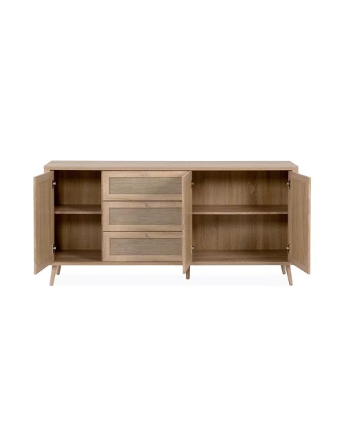 La credenza Kuta51A con 3 cassetti e 3 ante, renderà esotico e caldo il vostro ambiente. L'utilizzo di finiture naturali come le ante effetto rafia e la struttura nel colore rovere sonoma sono le caratteristiche principali di questa credenza alta. Gli spazi sono ben concepiti ed è possibile avere tutto in ordine grazie ai 2 ripiani e 3 generosi cassetti. Mobile ideale per chi vuole rendere originale ed unico ogni ambiente.