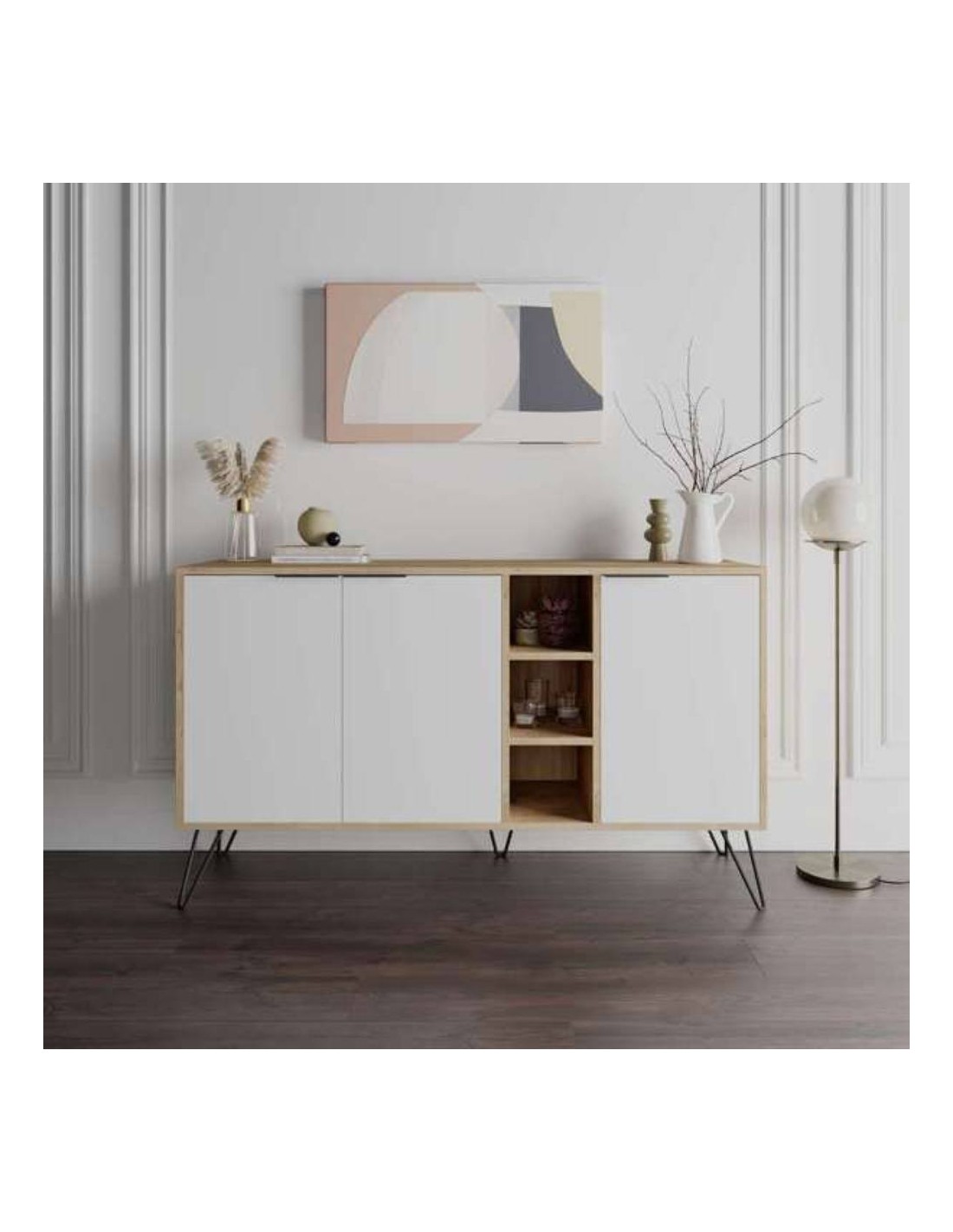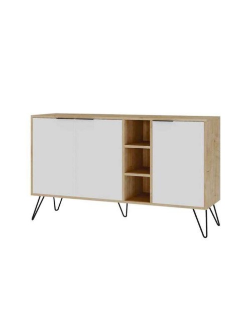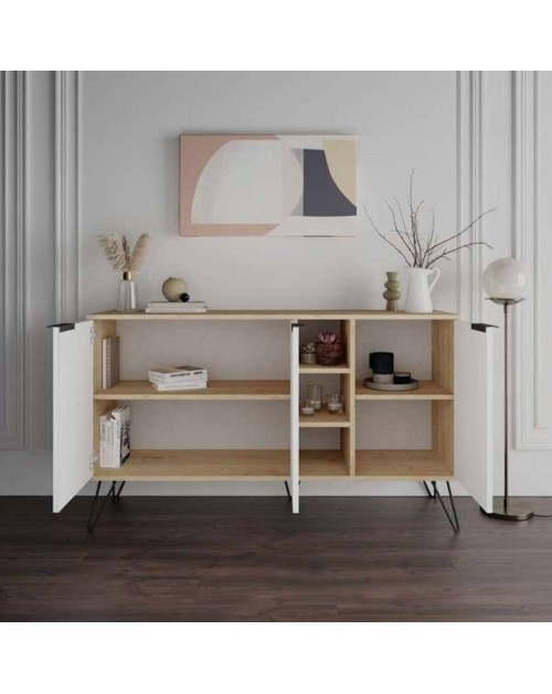 Linee moderne e vani capienti sono le caratteristiche principali della madia Clara. Il connubio di colori la rende facile da posizionare in ogni ambiente. I vani capienti possono ospitare tutti i tuoi oggetti e sono chiusi da tre ante battenti. I ripiani interni ti aiuteranno ad organizzare gli spazi. Inoltre la madia è dotata di 3 vani a giorno dove potrai esporre i tuoi libri e tanto altro. Molto eleganti i piedi in metallo nero.