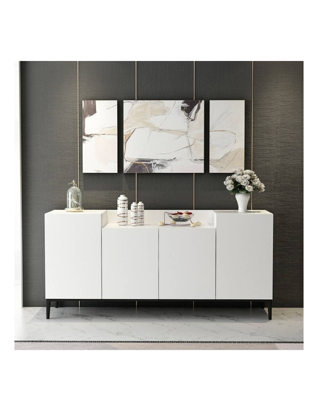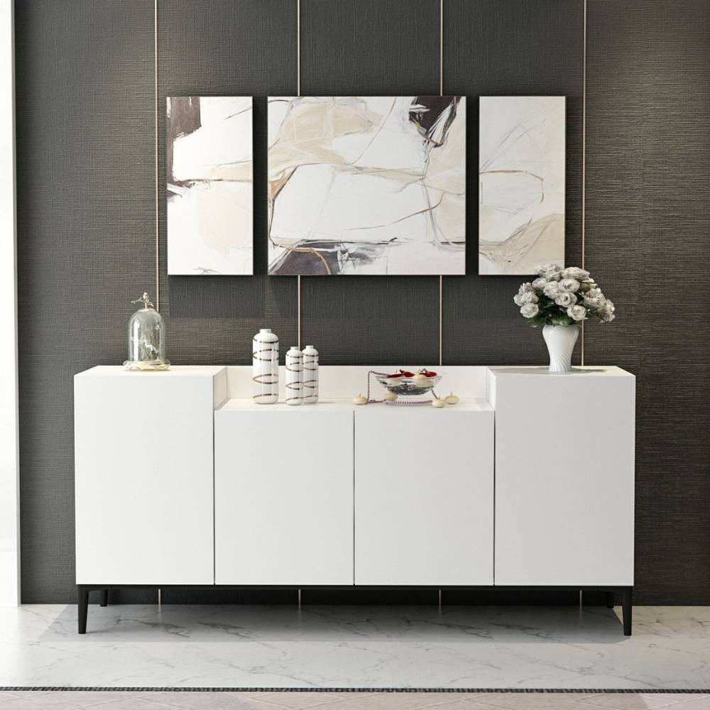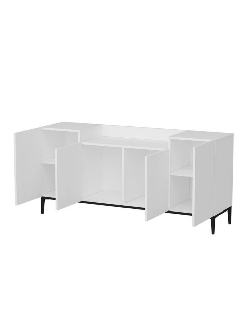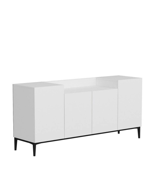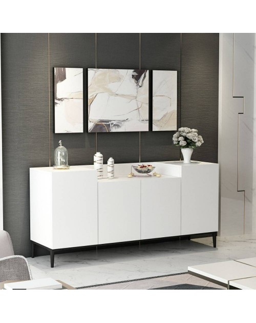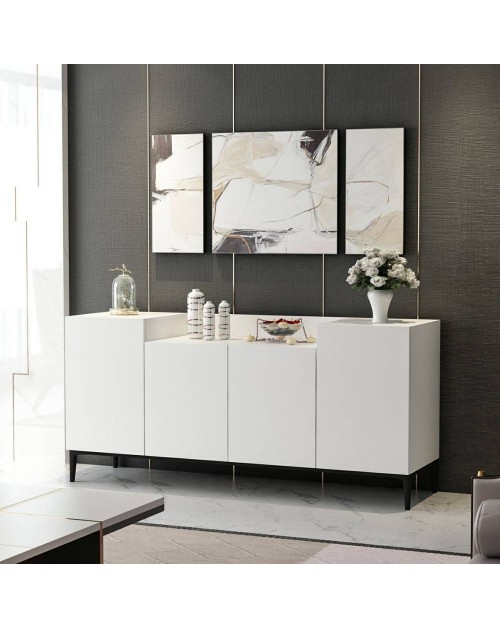 La madia 4 ante bianca Ellaria si caratterizza per il ripiano superiore con doppia altezza. Questa peculiarità rende questa madia posizionabile non solo nel salotto oppure in cucina ma anche in camera da letto.