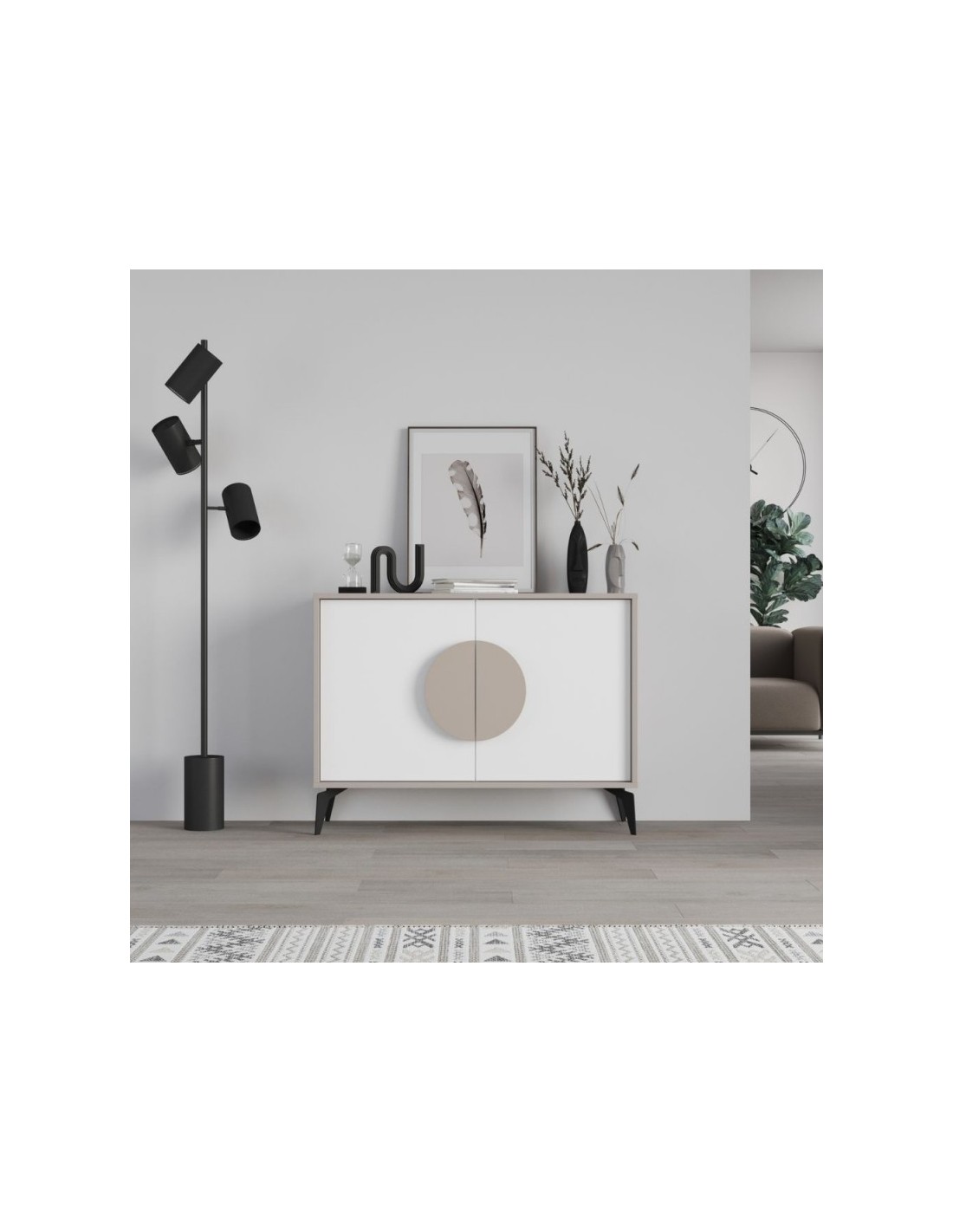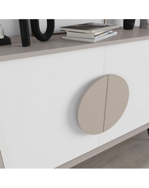 La struttura e la maniglia di design sono nel colore tortora, mentre le ante sono bianche e le gambe sono nere.