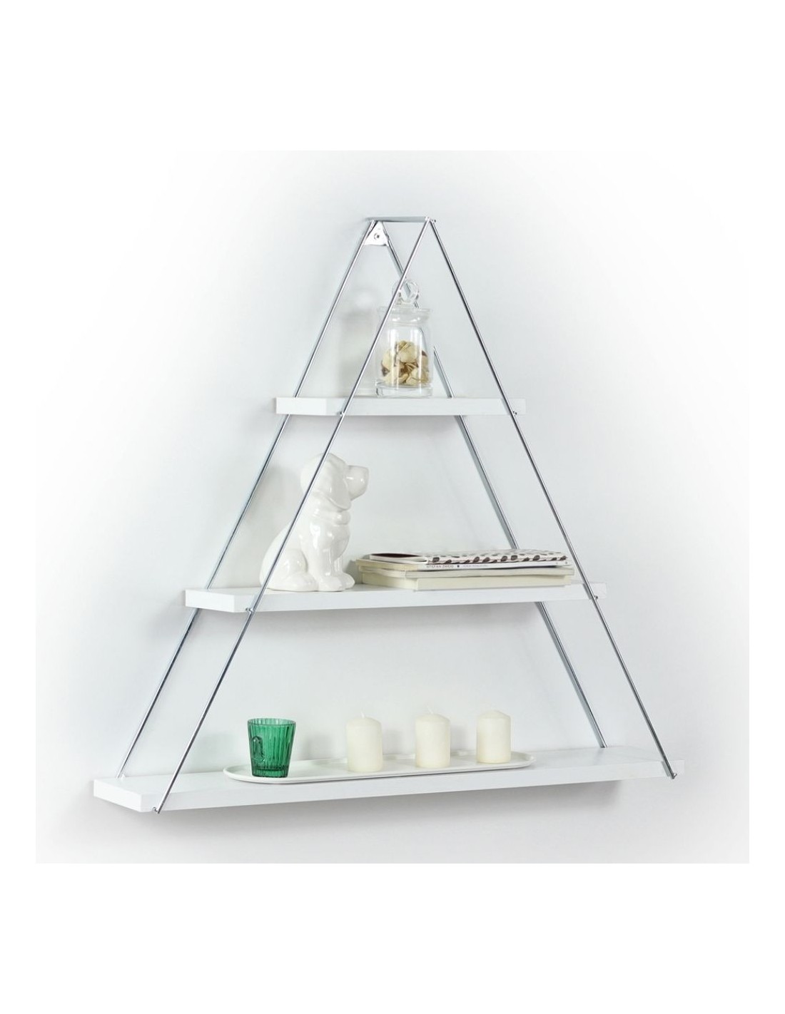 Mensola triangolare con tre ripiani con fissaggio a parete. Dettagli semplici ma eleganti, garantiranno la giusta sistemazione dei tuoi libri, vasi, piante e tutti gli oggetti che desideri. La puoi montare in cucina, in bagno, in soggiorno, la Moset si integrerà facilmente ad ogni ambiente.