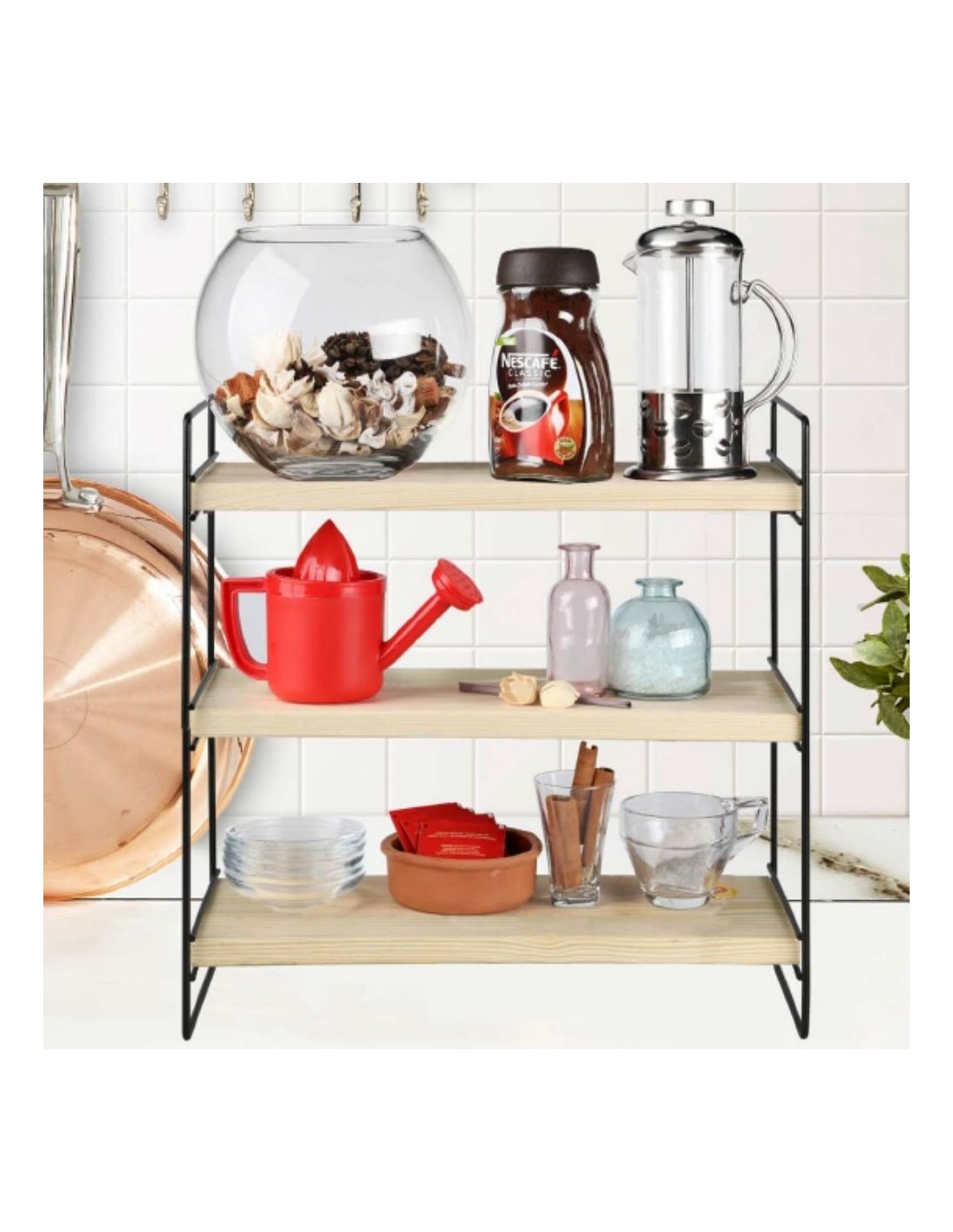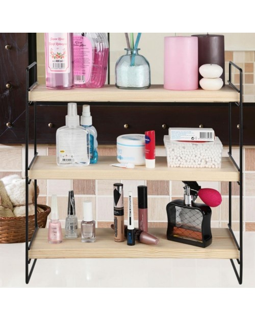 Solido e pratico scaffale d'appoggio, dotato di 3 ripiani in legno e struttura in metallo. Le sue applicazioni sono infinite, puoi usarlo ovunque tu voglia in casa: cucina, bagno, garage studio, ufficio etc.