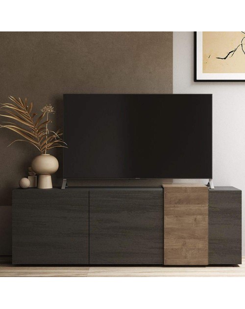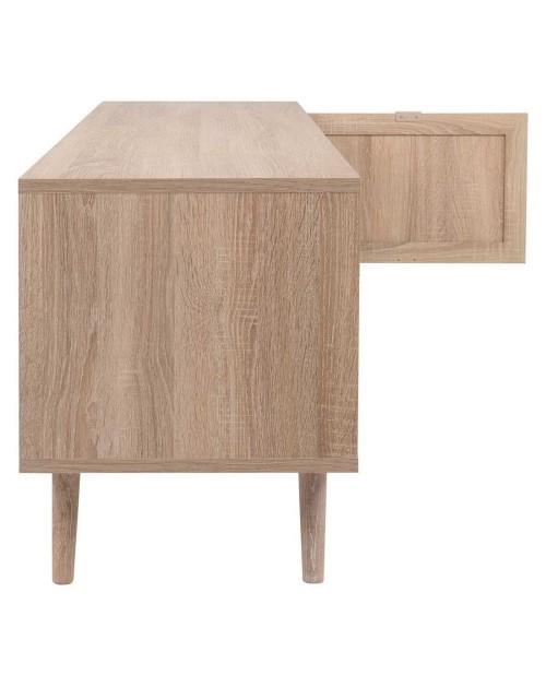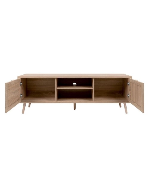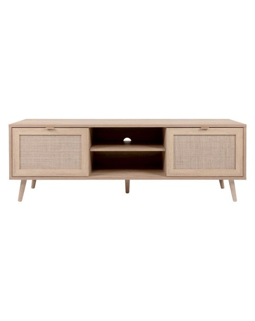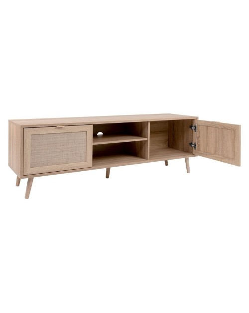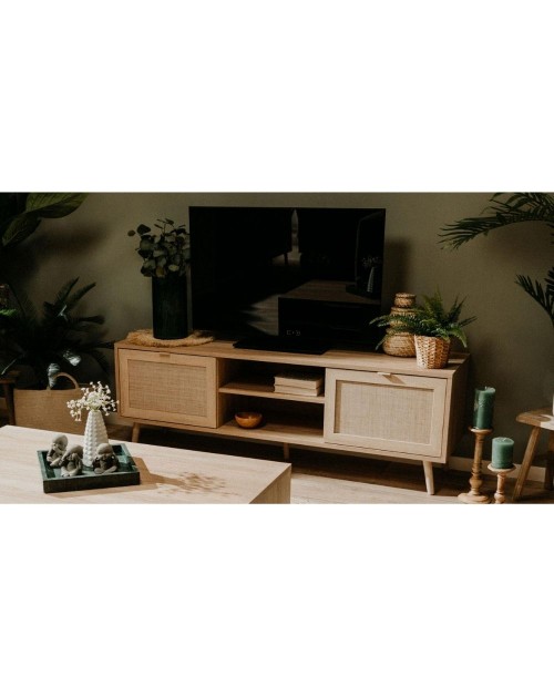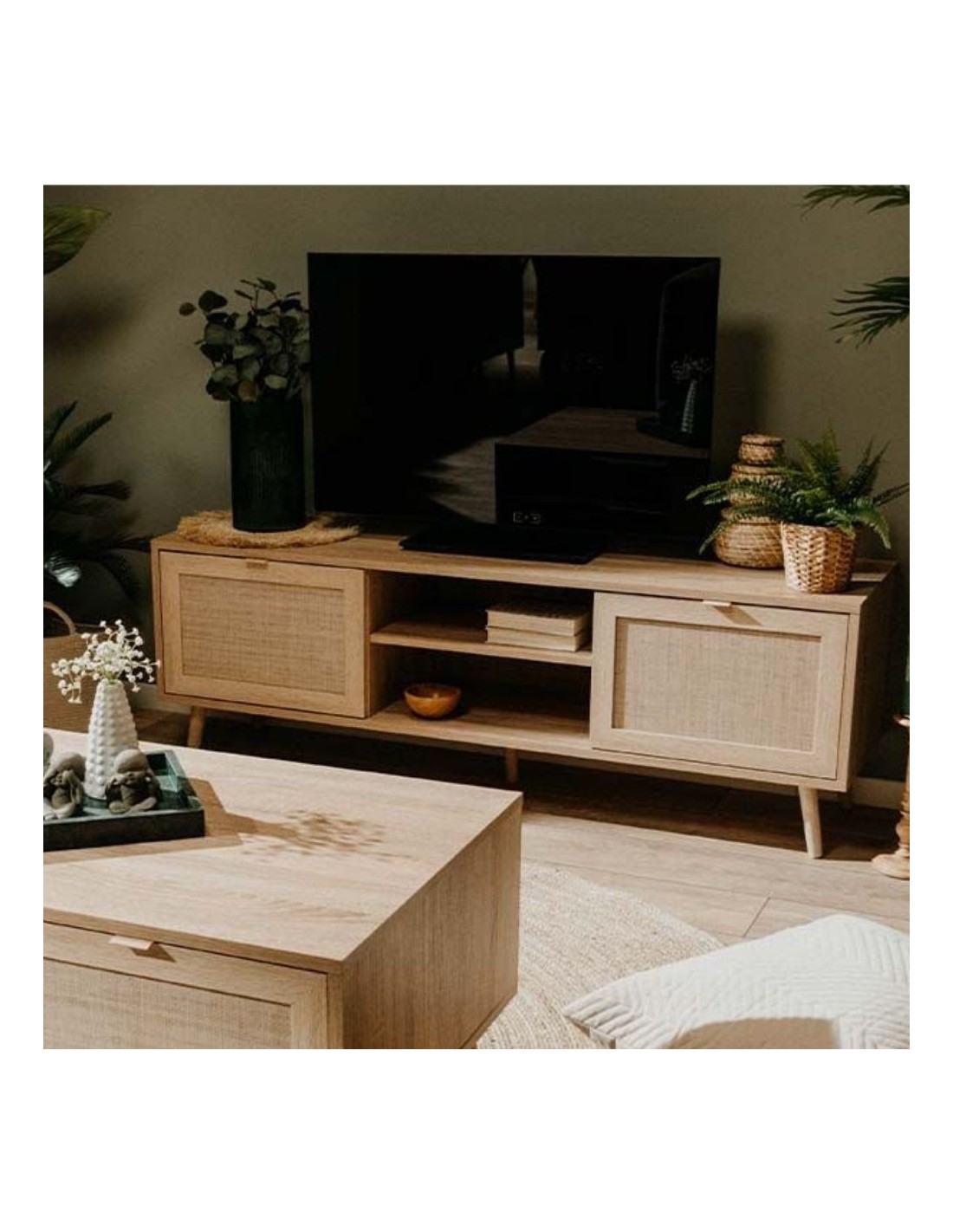 Raffinat mobile porta TV dotatO di 2 ante e un vano a giorno con ripiano. Si caratterizza per l'utilizzo di finiture naturali come le ante effetto vimini e la struttura nel colore quercia. Mobile ideale per chi vuole rendere originale ed unico ogni ambiente.