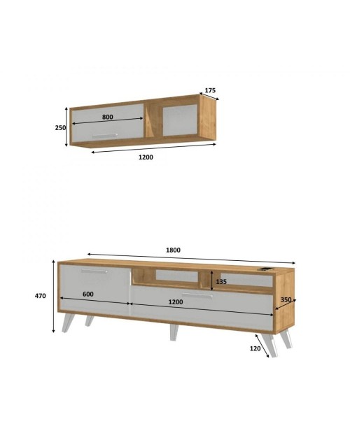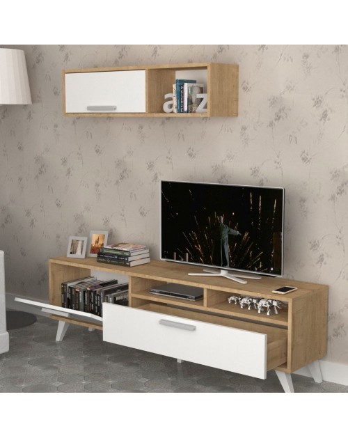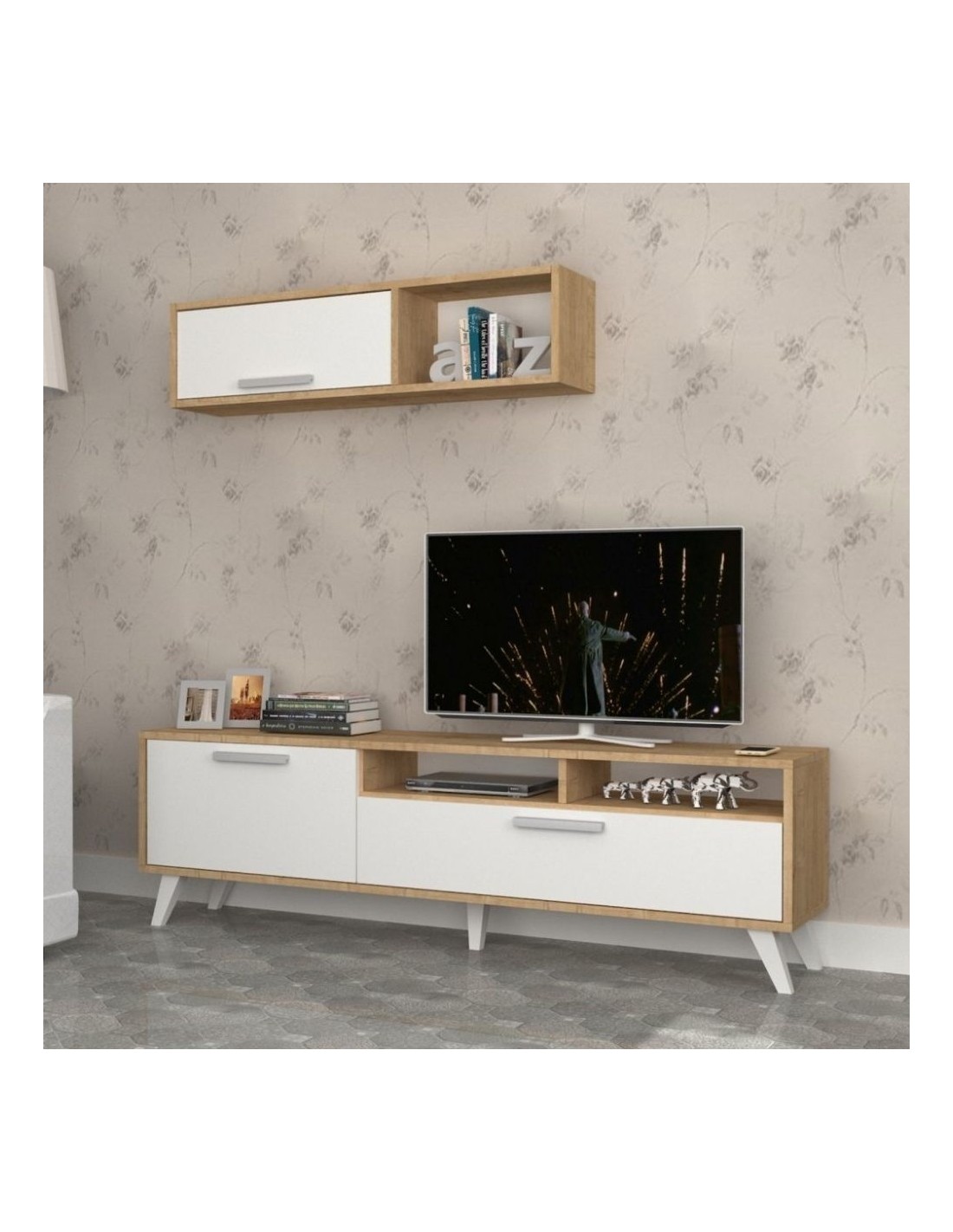 Mobile porta TV caratterizzato da una base e da un pensile, entrambi nel binomio cromatico rovere e bianco.