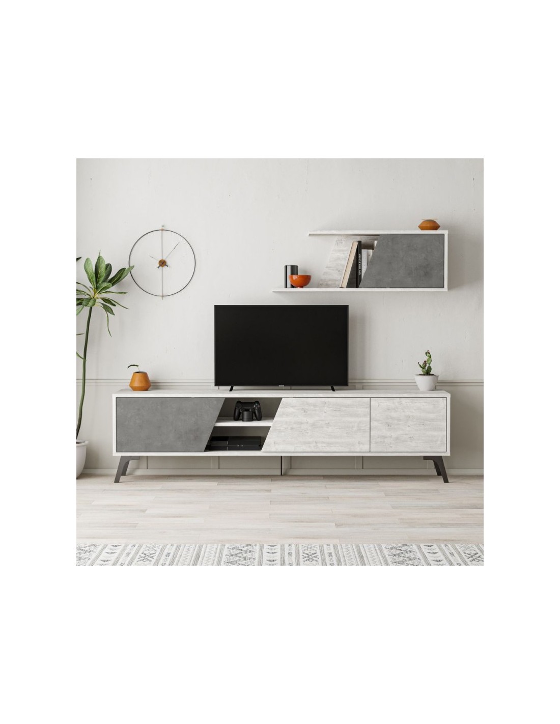 Il mobile porta TV Fiona bianco vintage e cemento è elegante e funzionale.È progettato per sostenere TV fino a 75 pollici oltre a fornire ulteriore spazio di archiviazione per oggetti come lettori multimediali, consolle di gioco, DVD e altri oggetti grazie alle 3 ante battenti. Molto comodo il vano a giorno con ripiano dove troveranno posto oggetti e dispositivi.