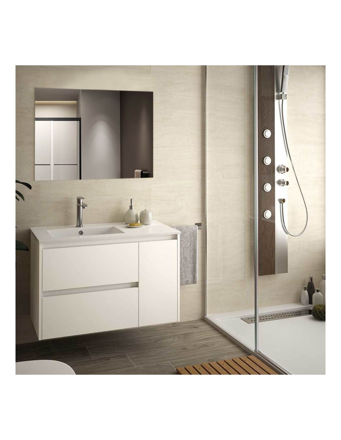 Mobile bagno sospeso compatto e funzionale. Dotato di due cassetti con chiusura ammortizzata e un’anta. Realizzato in melaminico. Il lavabo è in ceramica. Nel prezzo è incluso anche lo specchio