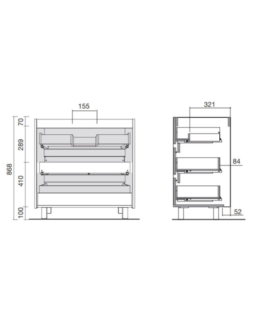 3 cassetti portata max 20 kg ciascuno con chiusura ammortizzata.