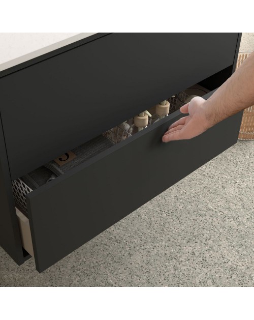Il mobile bagno sospeso Mango100 nero opaco si caratterizza per le linee semplici. E' dotato di 2 cassetti con chiusura ammortizzata, guide nascoste e regolazione in altezza. Il cassertto superiore presenta un pratico organizer. Il lavabo è in porcellana bianca. Per aprire i cassetti è sufficiente fare una leggera pressione grazie al meccanismo Push. Prodotto con materiali di alta qualità che assicurano resistenza all'usura per molto tempo.