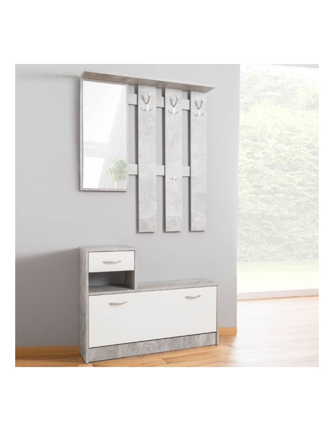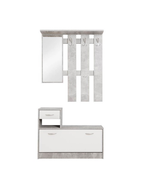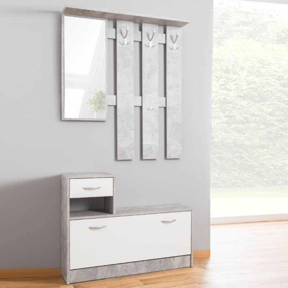 Il mobile ingresso Rudolf è dotato di specchio, 3 ganci appendiabito e scarpiera, 1 vano aperto, 1 ripiano per cappelli.