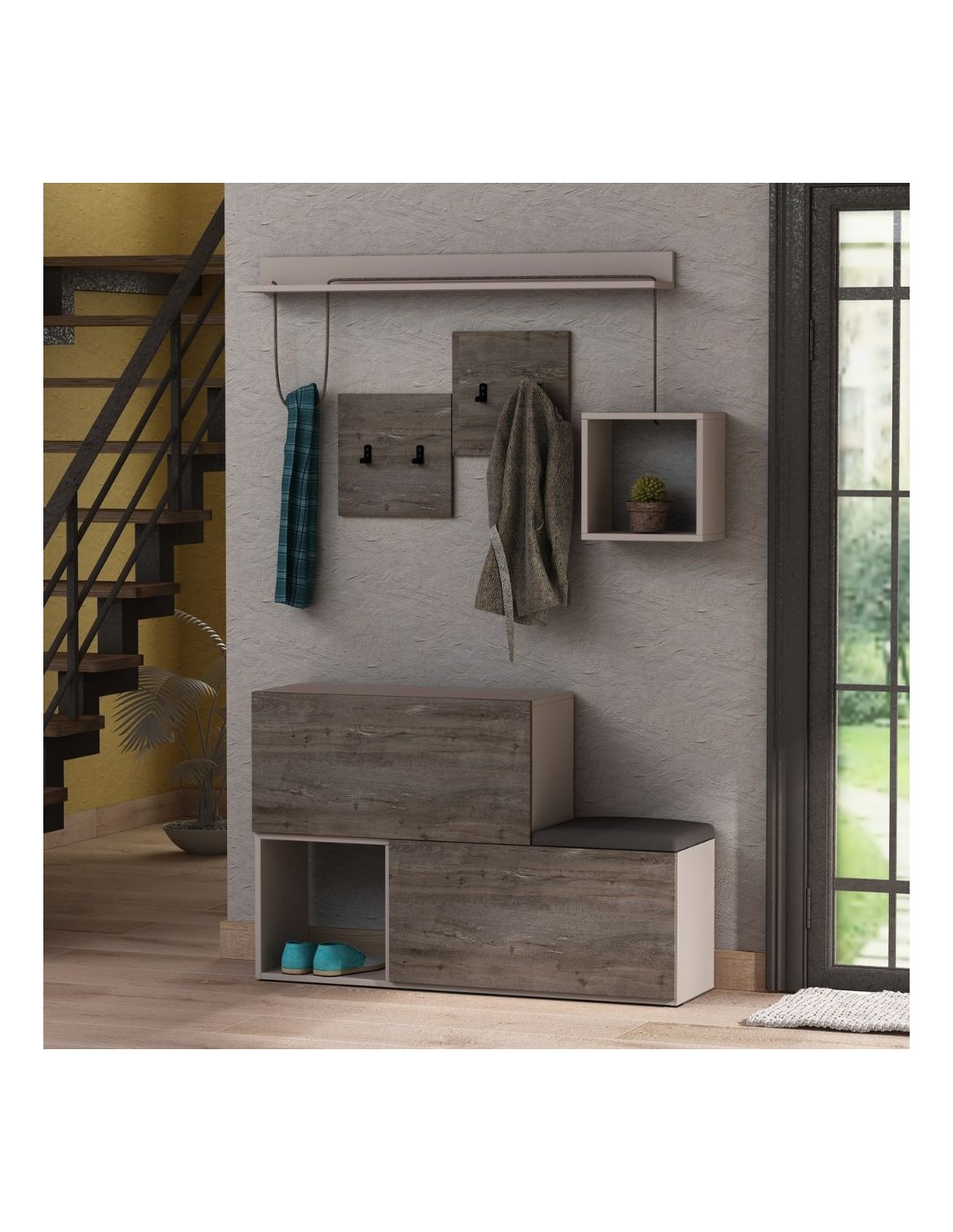 Mobile ingresso composto da scarpiera, appendiabiti e mensole. Arreda il tuo ingresso in modo funzionale, combinando praticità e qualità costruttiva. Il mobile Holdon propone una doppia scarpiera con ante a ribalta dove riporre circa 12 paia di scarpe. Un comodo cuscino dove sedersi per indossare le scarpe. Quattro ganci per riporre gli abiti e un cubotto pensile che si lega alla mensola superiore tramite una raffinata corda.