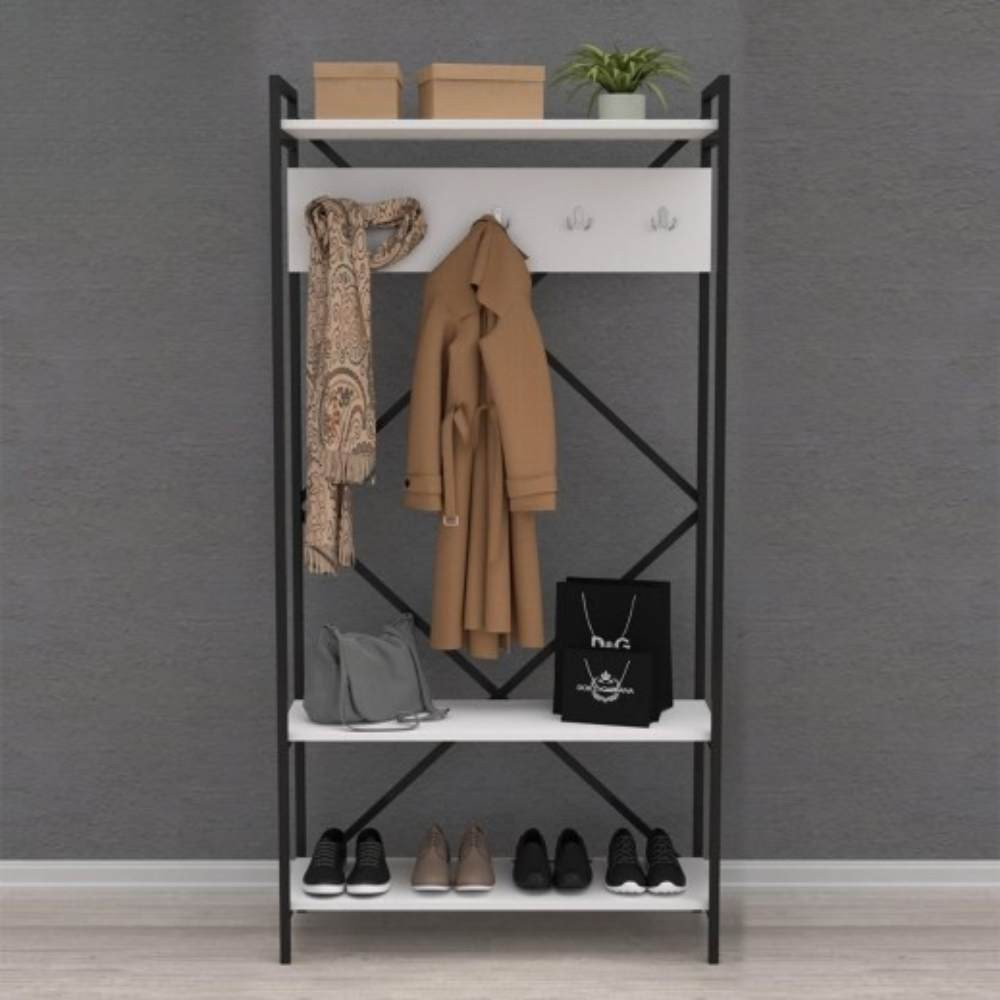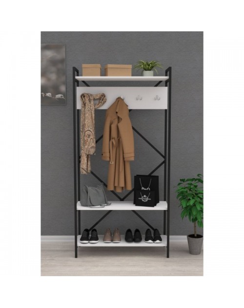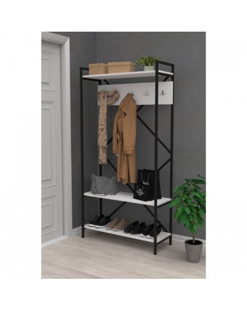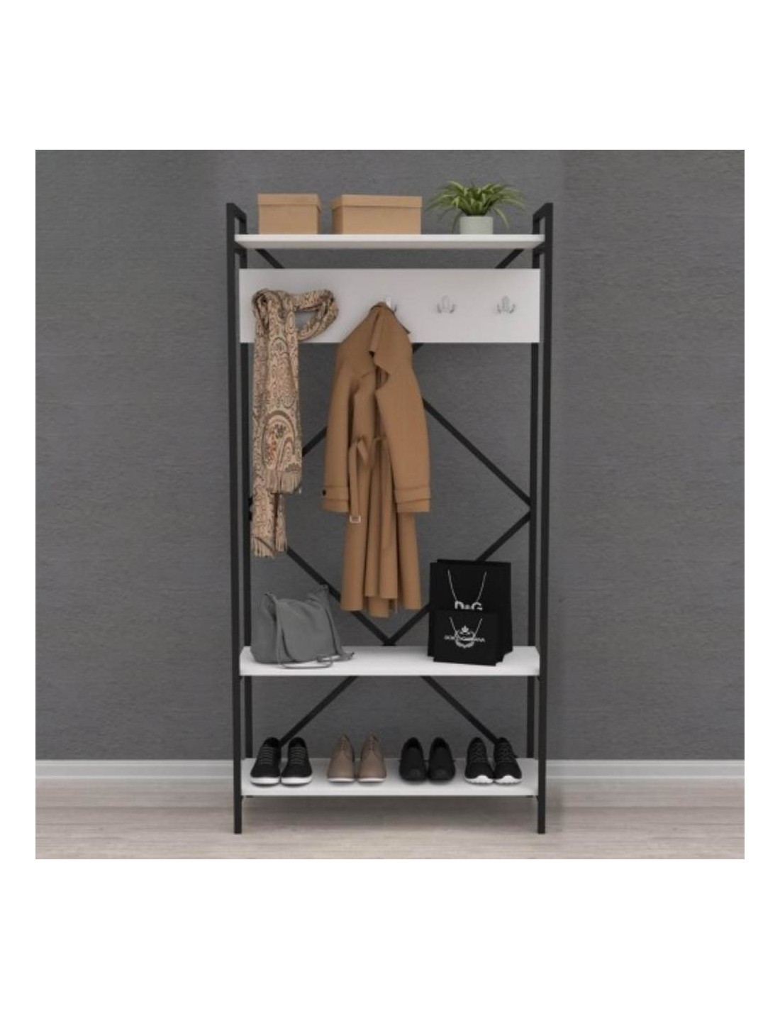 Il mobile ingresso con appendiabiti Navis bianco è la soluzione per arredare in modo funzionale la zona ingresso. La struttura in metallo garantisce spazio e solidità per ben 3 ripiani e una rastrelliera dotata di 5 ganci multipli dove appendere giacche e cappotti. Scarpe, stivali, borse e tanti altri oggetti, troveranno il loro ordine grazie a questo fantastico mobile.