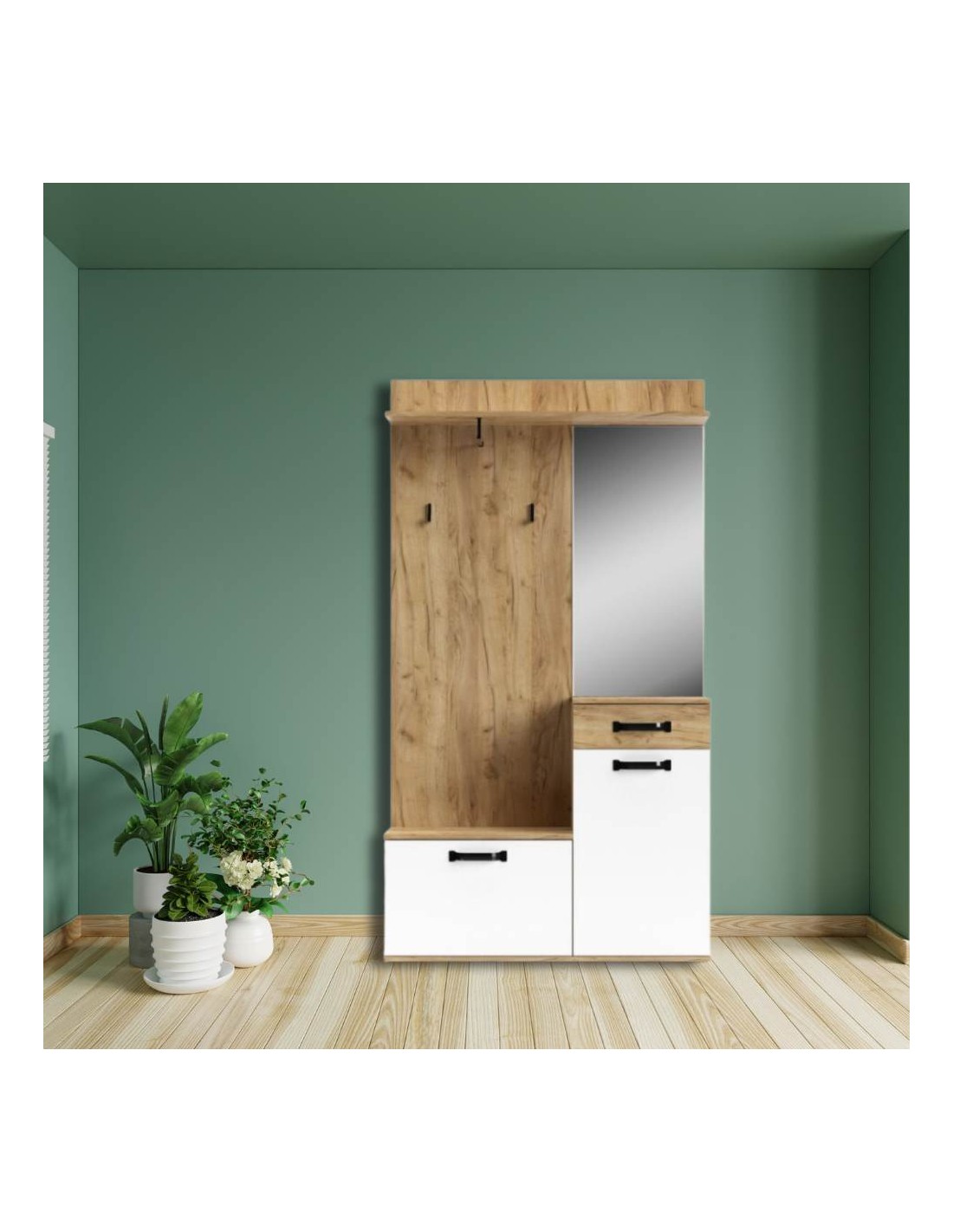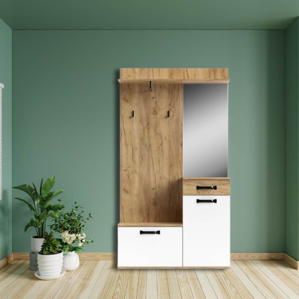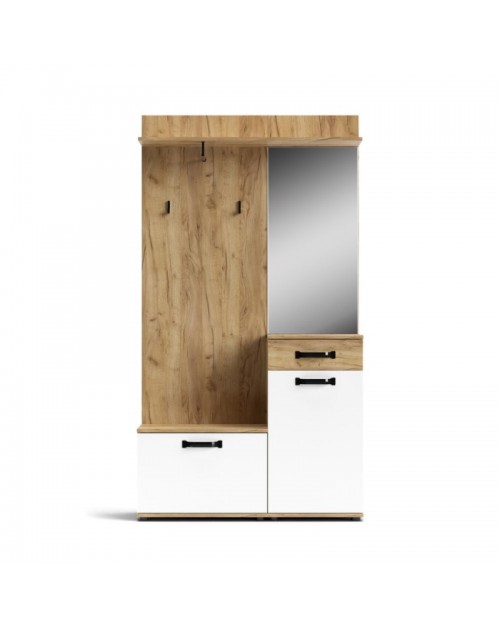 Il mobile ingresso rovere bianco Mosso MO6 è la soluzione per avere tutto in ordine. E' dotato di due vani chiusi da ante, un cassetto, uno specchio, ganci appendiabiti, una scarpiera ed una mensola. Tutto in un solo mobile. I colori neutri come il rovere ed il bianco, sono facilmente abbinabili ad ogni ambiente, che sia casa, studio oppure ufficio. Presenta maniglie in metallo nero e prodotto con materiali di qualità per durare nel tempo.