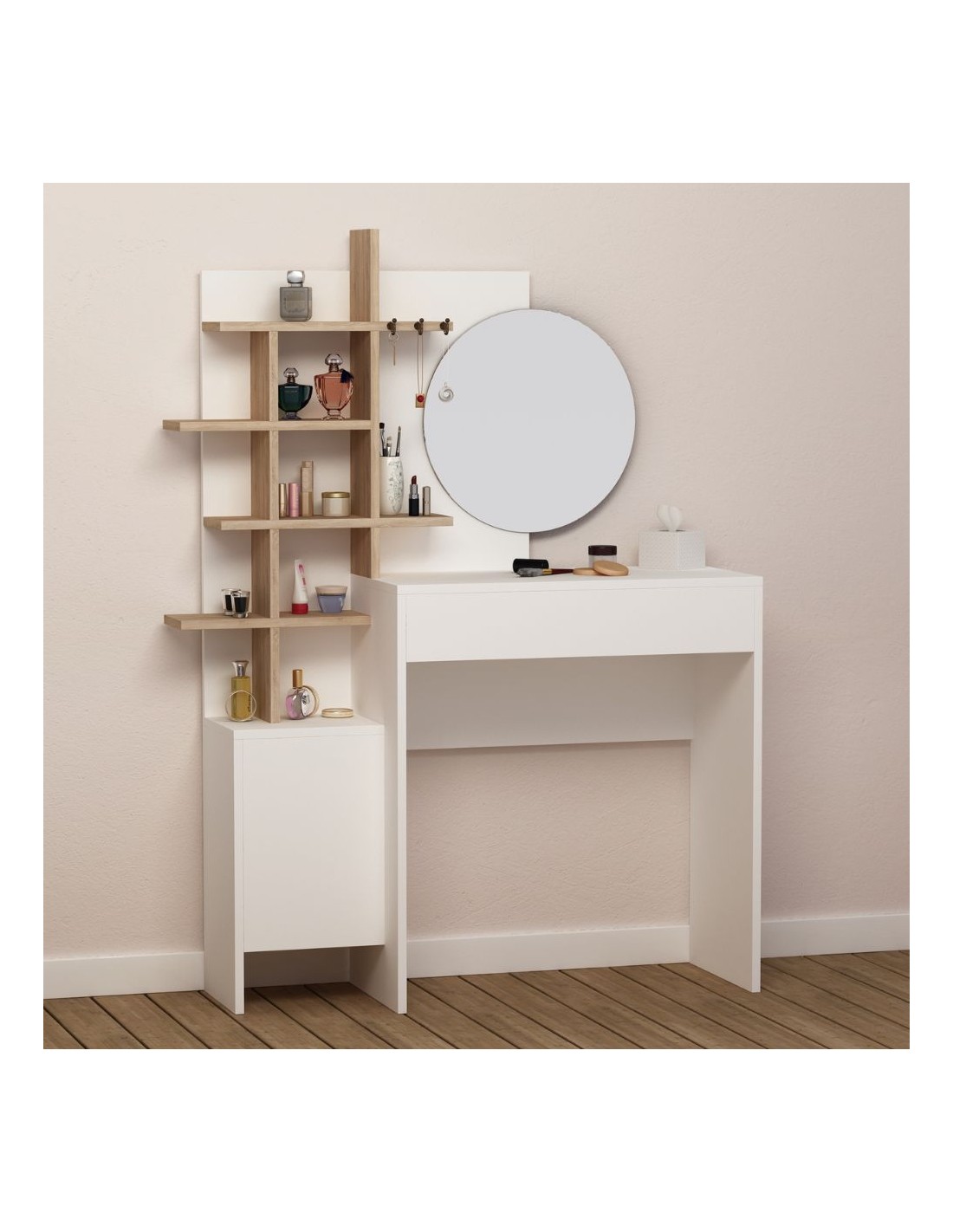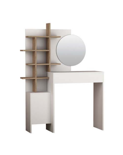La toilette trucco bianca con vani a giorno rovere Mup, ha tutto ciò che serve per il tuo angolo trucco.