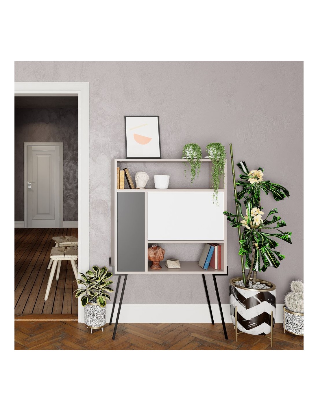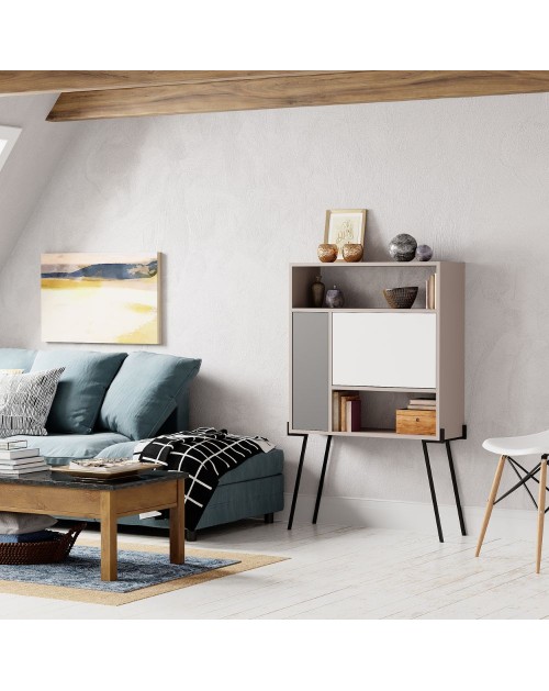 Puoi usarla come credenza alta, grazie ai piedi in metallo e ai numerosi vani chiusi e a giorno.