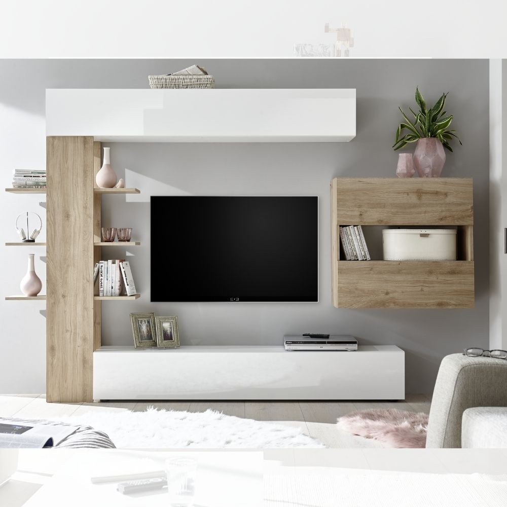 Comoda, robusta e di design: adatta ad una casa moderna e funzionale, questa parete attrezzata si distingue per la grande varietà di elementi uniti e per la finitura pulita bianca lucida e beton.
