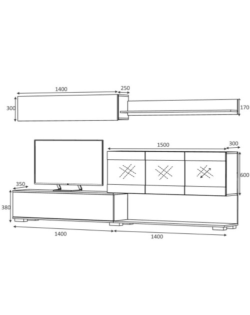 Misure modulo base tv con ribalta L 140 x P 35 x 38 H cm.
